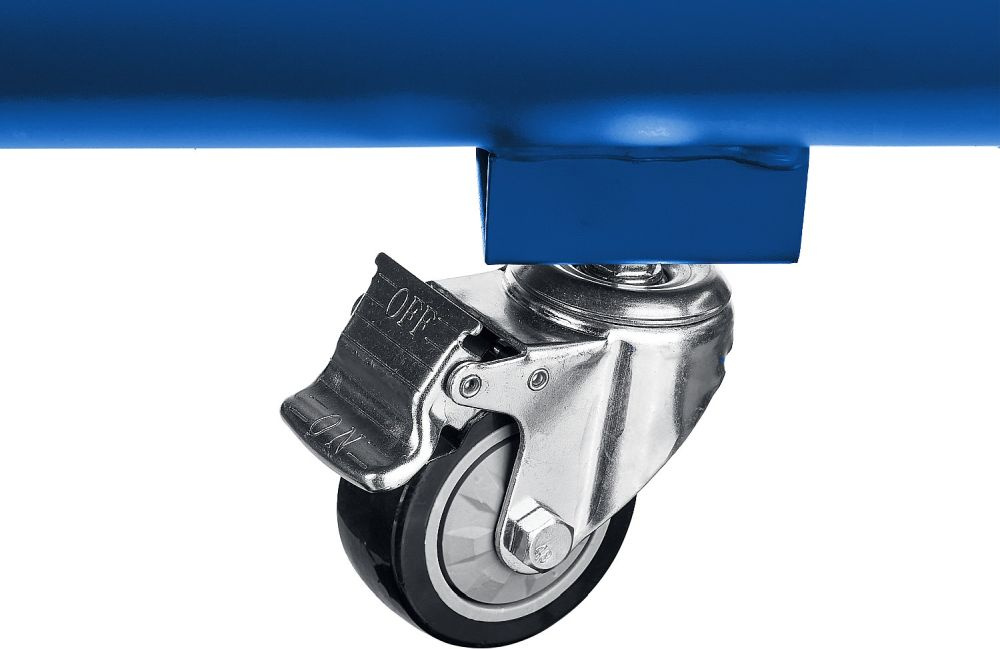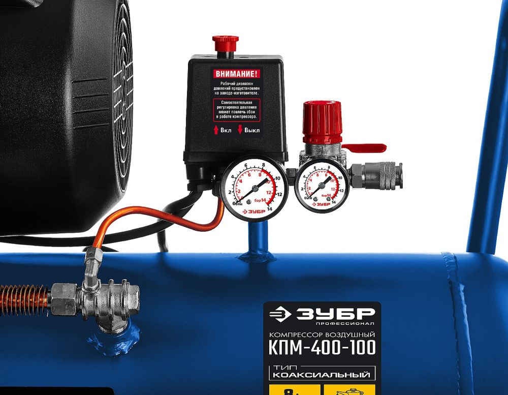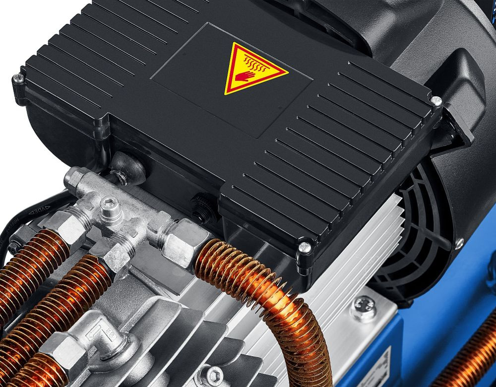 Механический клапан сброса давления. Шумозащитный пластиковый кожух. Эргономичная ручка и колеса для удобства транспортировки. Возможность подсоединения дополнительного ресивера или штуцера. Контроль давления в ресивере и на выходе при помощи двух манометров.