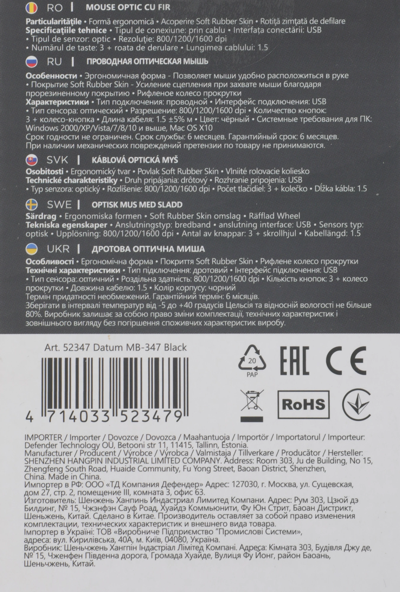 черный оптическая 1600dpi USB 3but (52347)