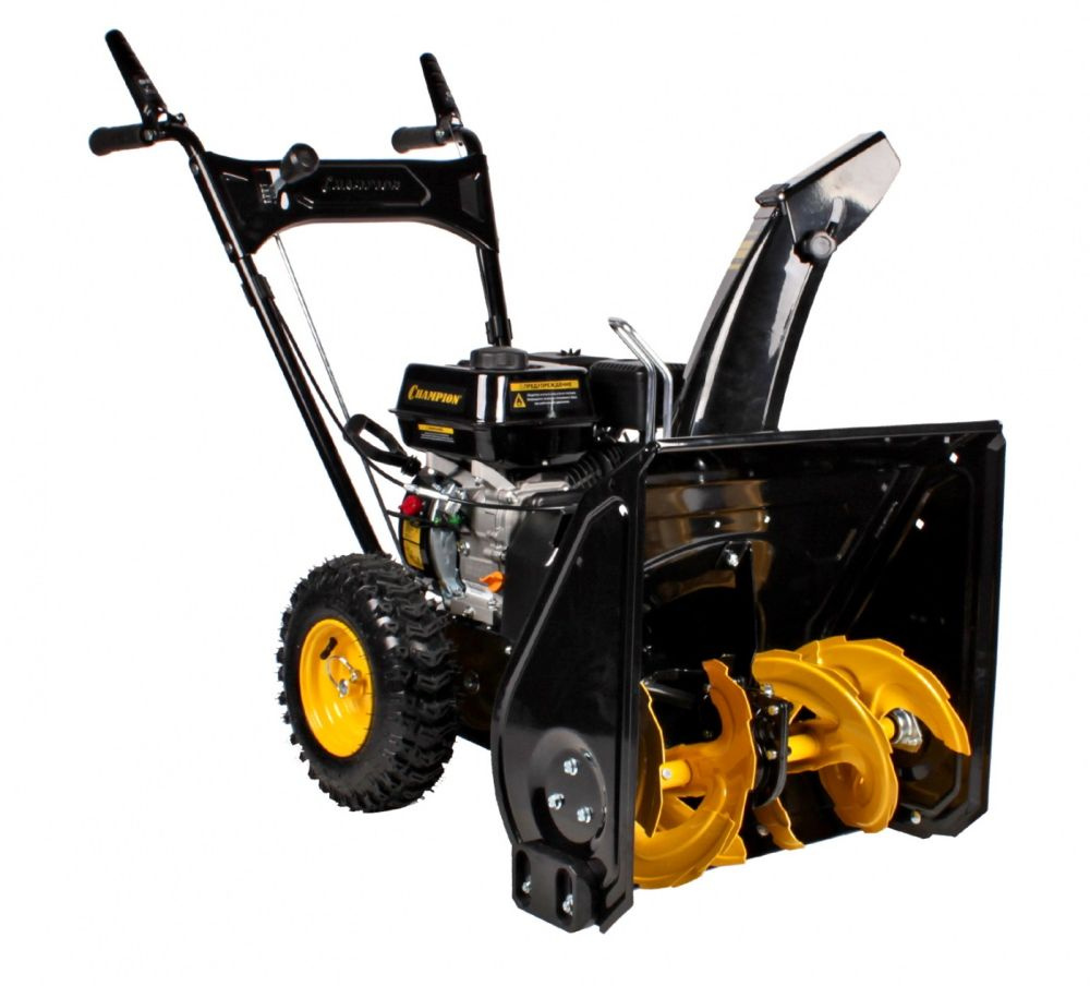 Снегоотбрасыватель CHAMPION ST553. Отличается большой мощностью и независимостью от стороннего источника питания. Благодаря двухступенчатой системе шнеков, агрегат способен отбрасывать снег на расстояние до 11 м. Прочный металлический сплав позволяет шнеку обрабатывать снег любой сложности.