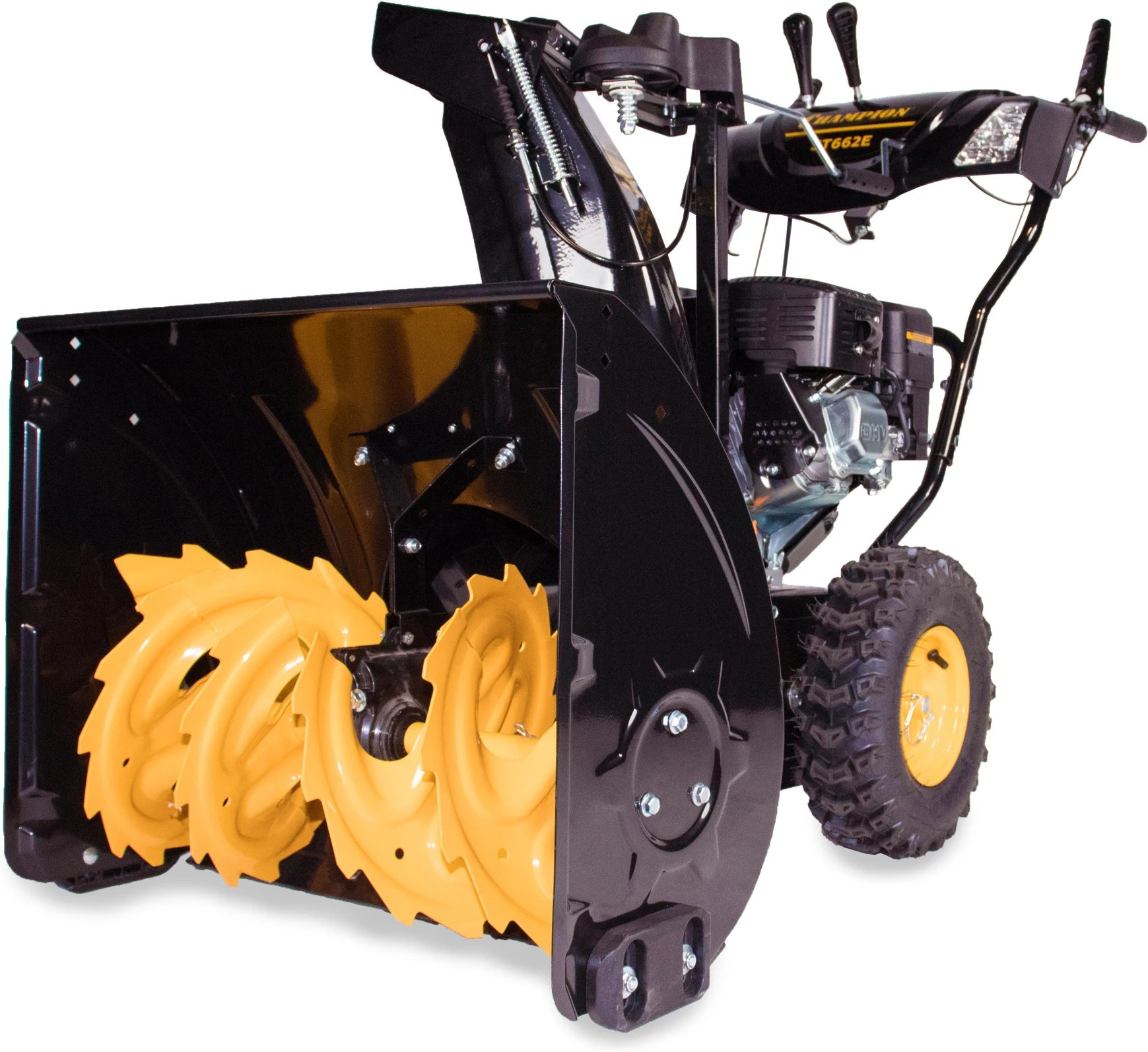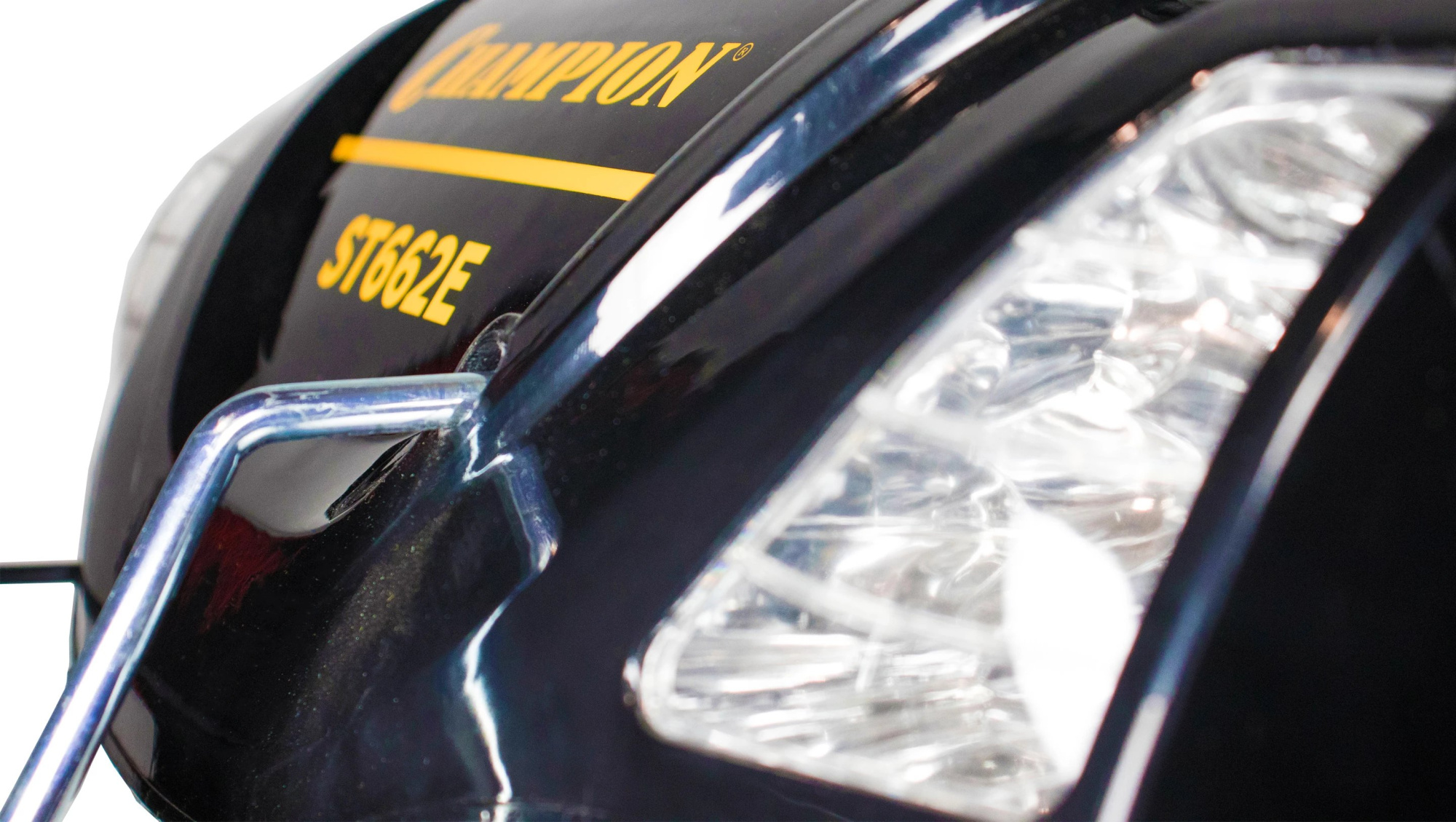 Снегоотбрасыватель CHAMPION ST662E. Оснащен двухступенчатой системой шнеков. Электрический стартер, подключаемый к электросети, обеспечивает легкий запуск мотора при любой температуре. Фары позволят проводить работы в условиях зимних сумерек. Обогрев рукояток обеспечивает комфортную работу в холод.