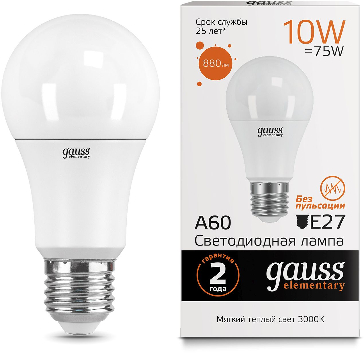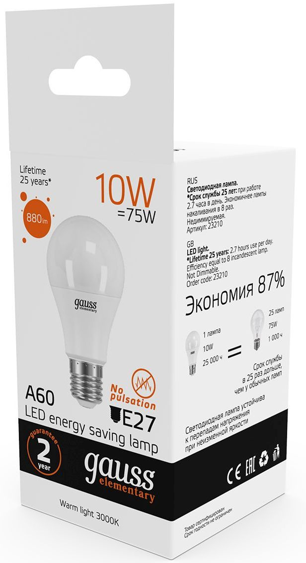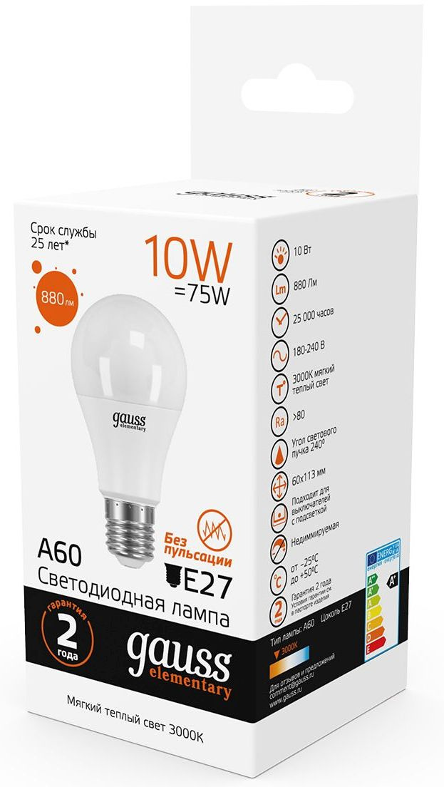 Светодиодная лампа Gauss - безопасный для здоровья и окружающей среды источник света. Она не пульсирует, мгновенно включается, не содержит ртути и имеет больший срок службы, чем лампы накаливания и КЛЛ, экономичнее ламп накаливания до 10 раз.