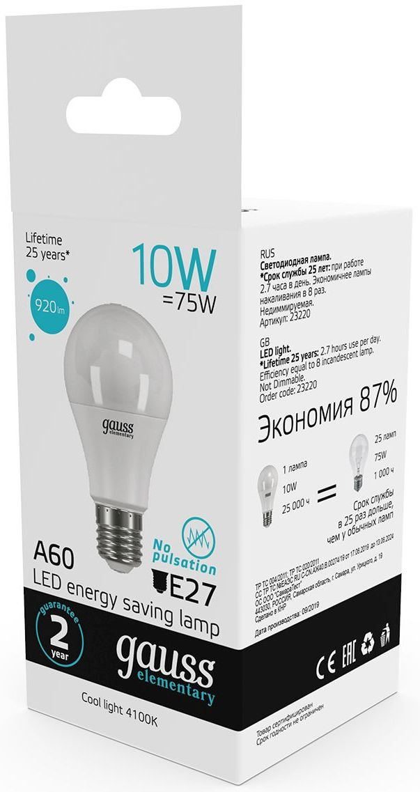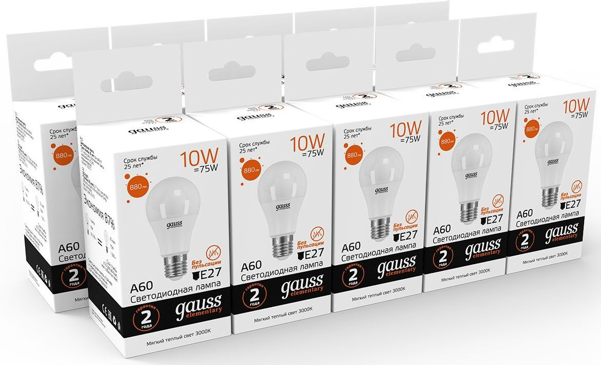 Лампа светодиодная Gauss Elementary 10Вт цок.:E27 груша 220B св.свеч.бел.нейт. A60 (упак.:10шт) (23220)