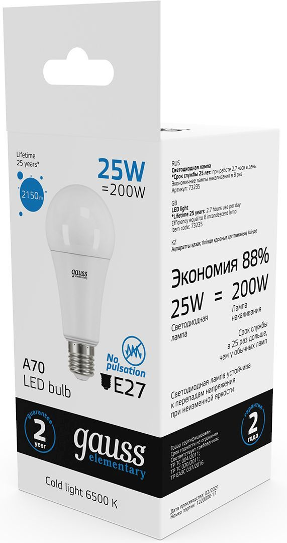 Светодиодная лампа Gauss - безопасный для здоровья и окружающей среды источник света. Она не пульсирует, мгновенно включается, не содержит ртути и имеет больший срок службы, чем лампы накаливания и КЛЛ, экономичнее ламп накаливания до 10 раз.