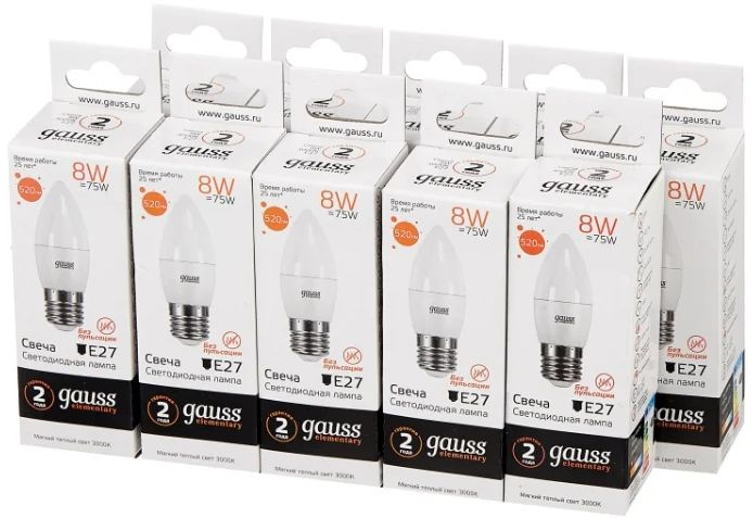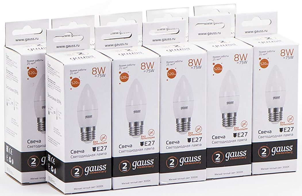 Лампа светодиодная Gauss Elementary 8Вт цок.:E27 свеча 220B св.свеч.бел.теп. C37 (упак.:10шт) (33218)
