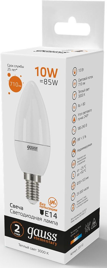 Светодиодная лампа Gauss - безопасный для здоровья и окружающей среды источник света. Она не пульсирует, мгновенно включается, не содержит ртути и имеет больший срок службы, чем лампы накаливания и КЛЛ, экономичнее ламп накаливания до 10 раз.