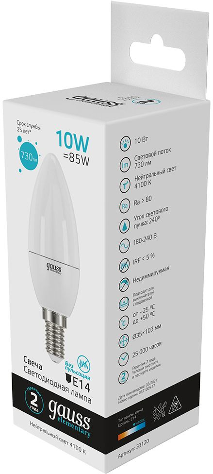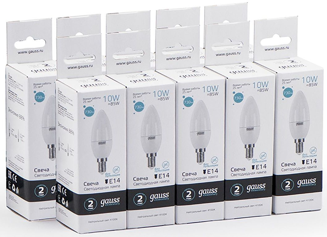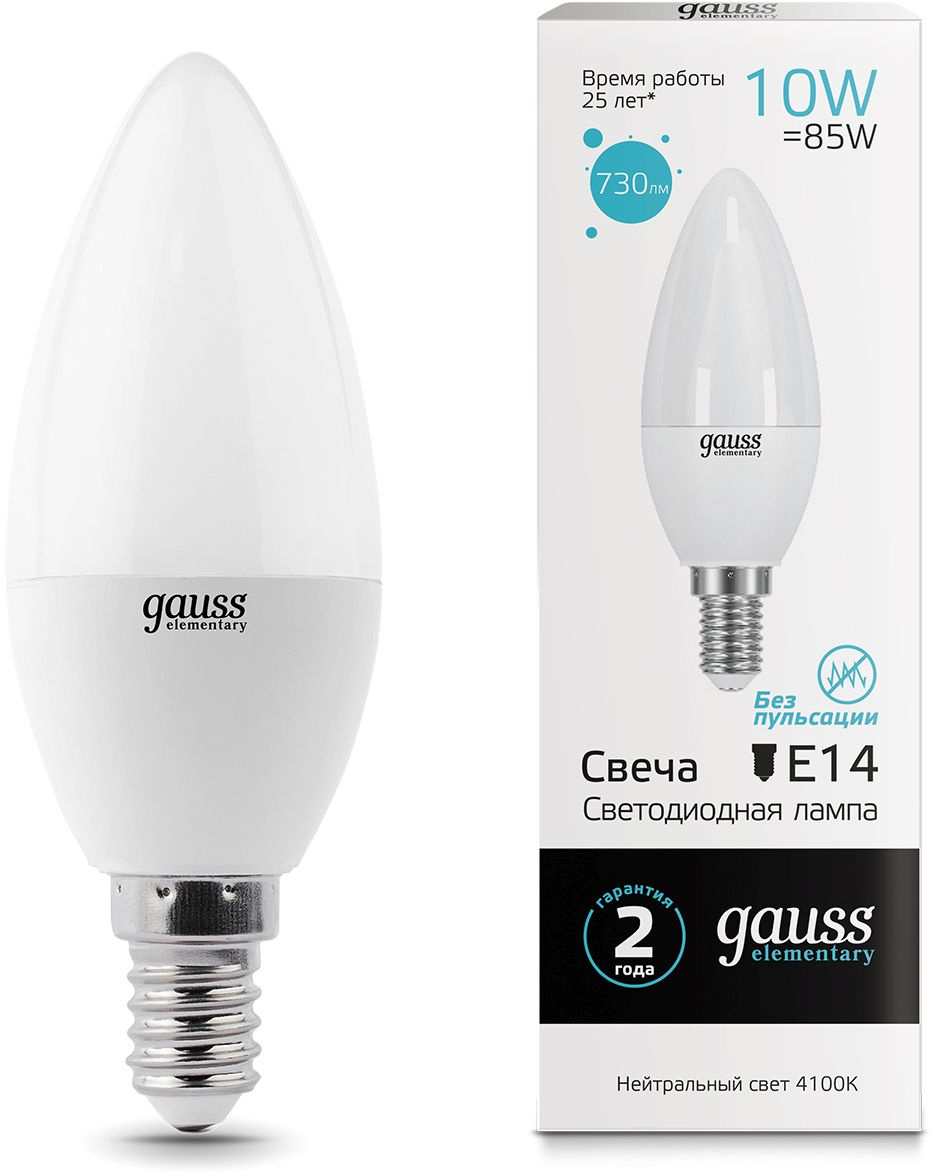 Лампа светодиодная Gauss Elementary 10Вт цок.:E14 свеча 220B св.свеч.бел.нейт. C37 (упак.:10шт) (33120)