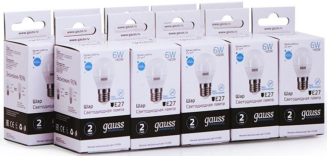 Лампа светодиодная Gauss Elementary 6Вт цок.:E27 шар 220B св.свеч.бел.нейт. (упак.:10шт) (53226)