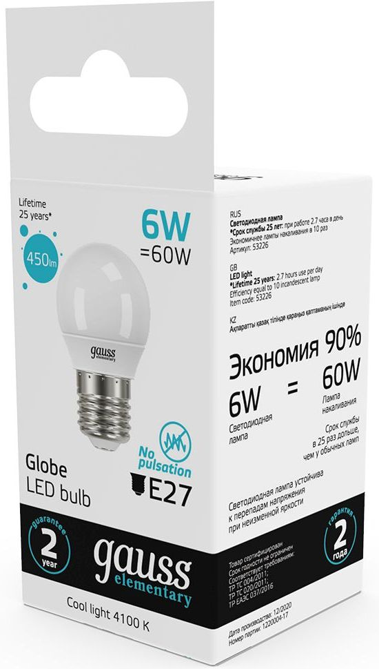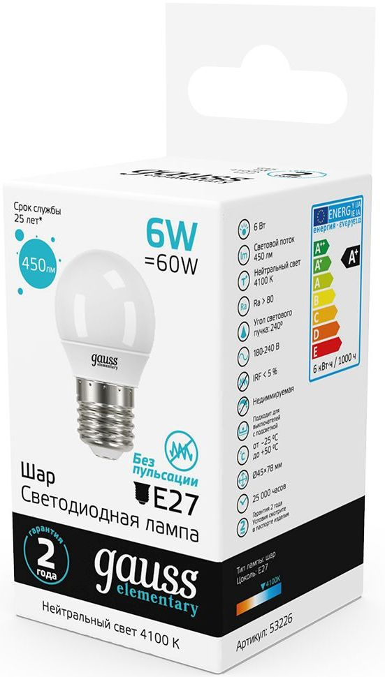 Светодиодная лампа Gauss - безопасный для здоровья и окружающей среды источник света. Она не пульсирует, мгновенно включается, не содержит ртути и имеет больший срок службы, чем лампы накаливания и КЛЛ, экономичнее ламп накаливания до 10 раз.