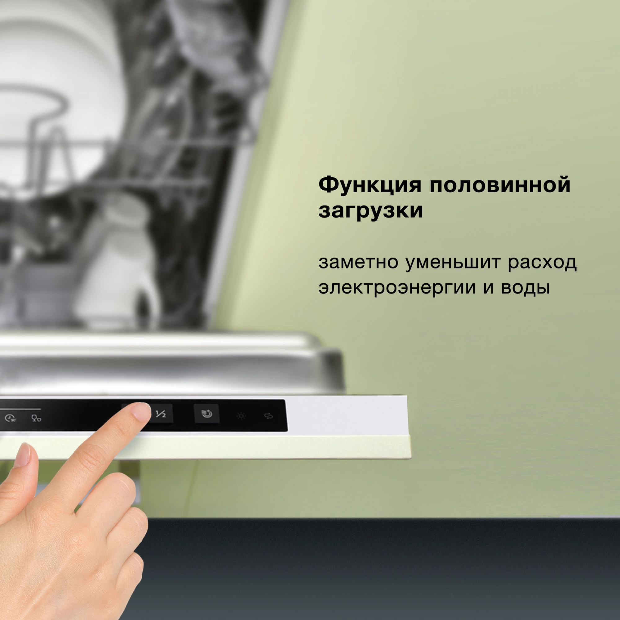 Если посудомоечная машина загружена частично – можно включить режим мойки при половинной загрузке. В этом режиме посуда тщательно промывается, но при этом экономится потребляемый объем воды и электроэнергии.
