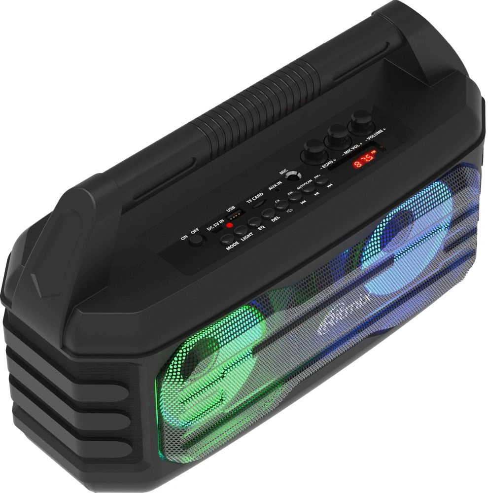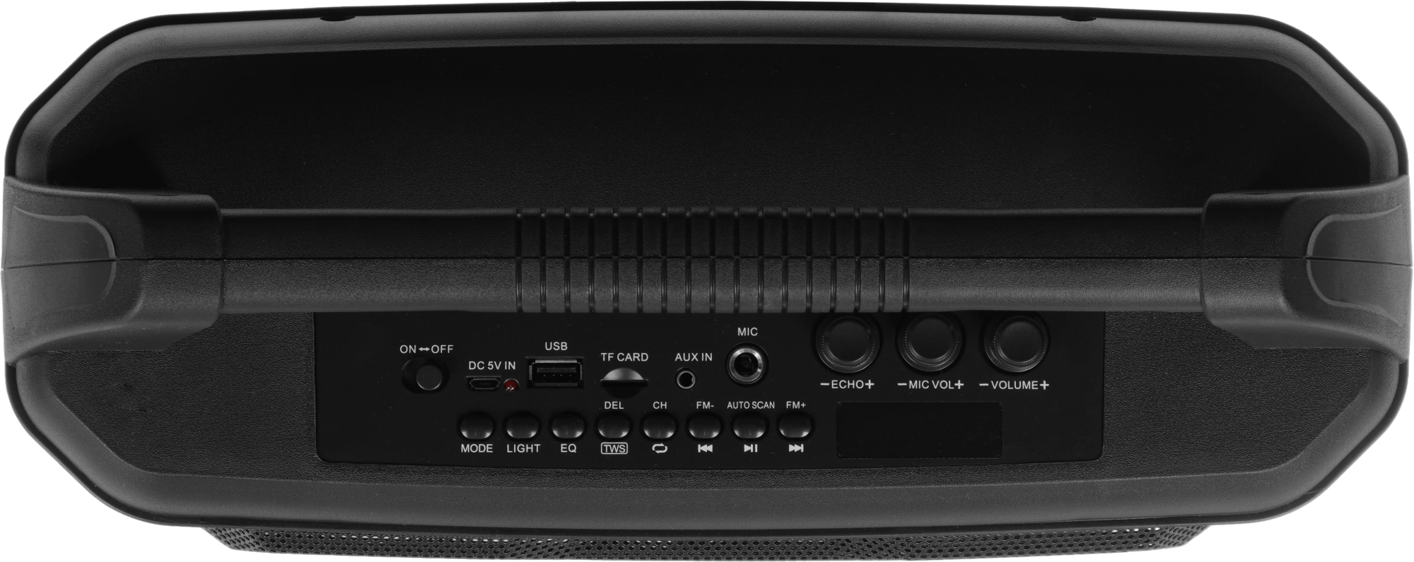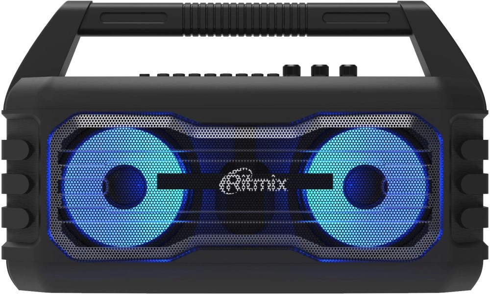 Портативная Bluetooth-колонка, имеющая AUX-вход, 6,3 мм вход для микрофона и встроенный FM-радиоприёмник, а также способная воспроизводить музыку с карточки microSD или USB-флешки.