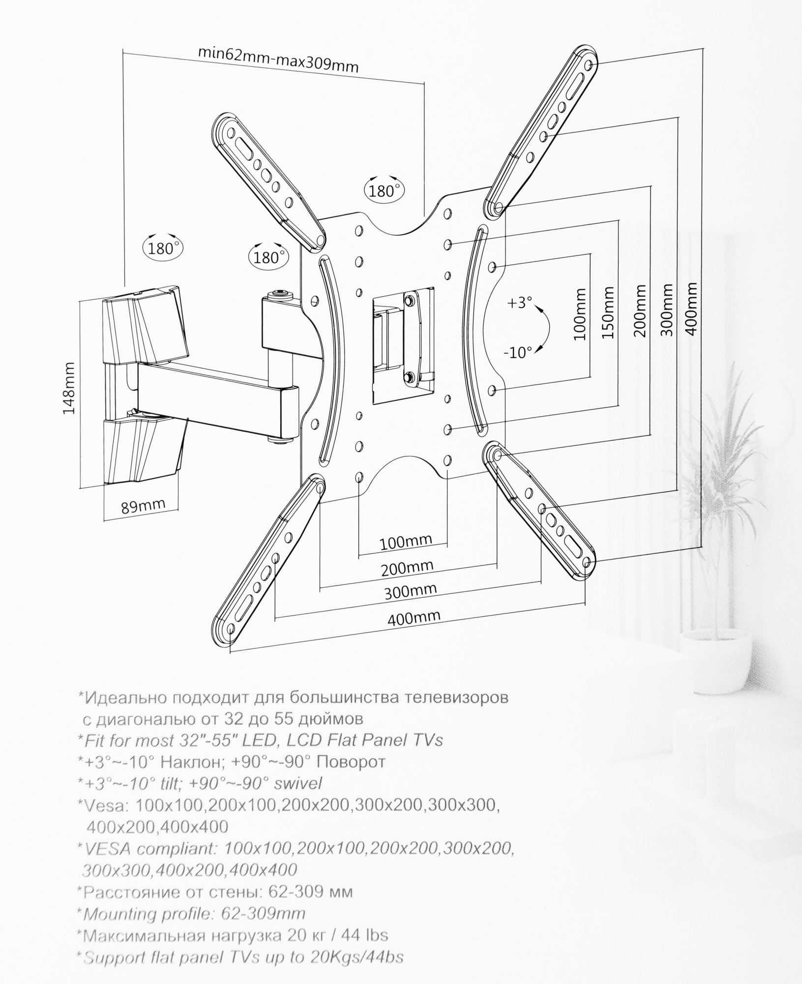 черный 32"-55" макс.20кг настенный поворотно-выдви...