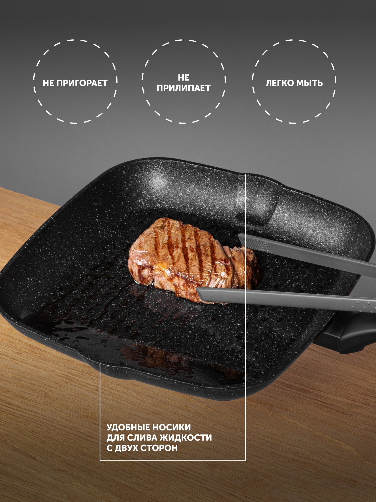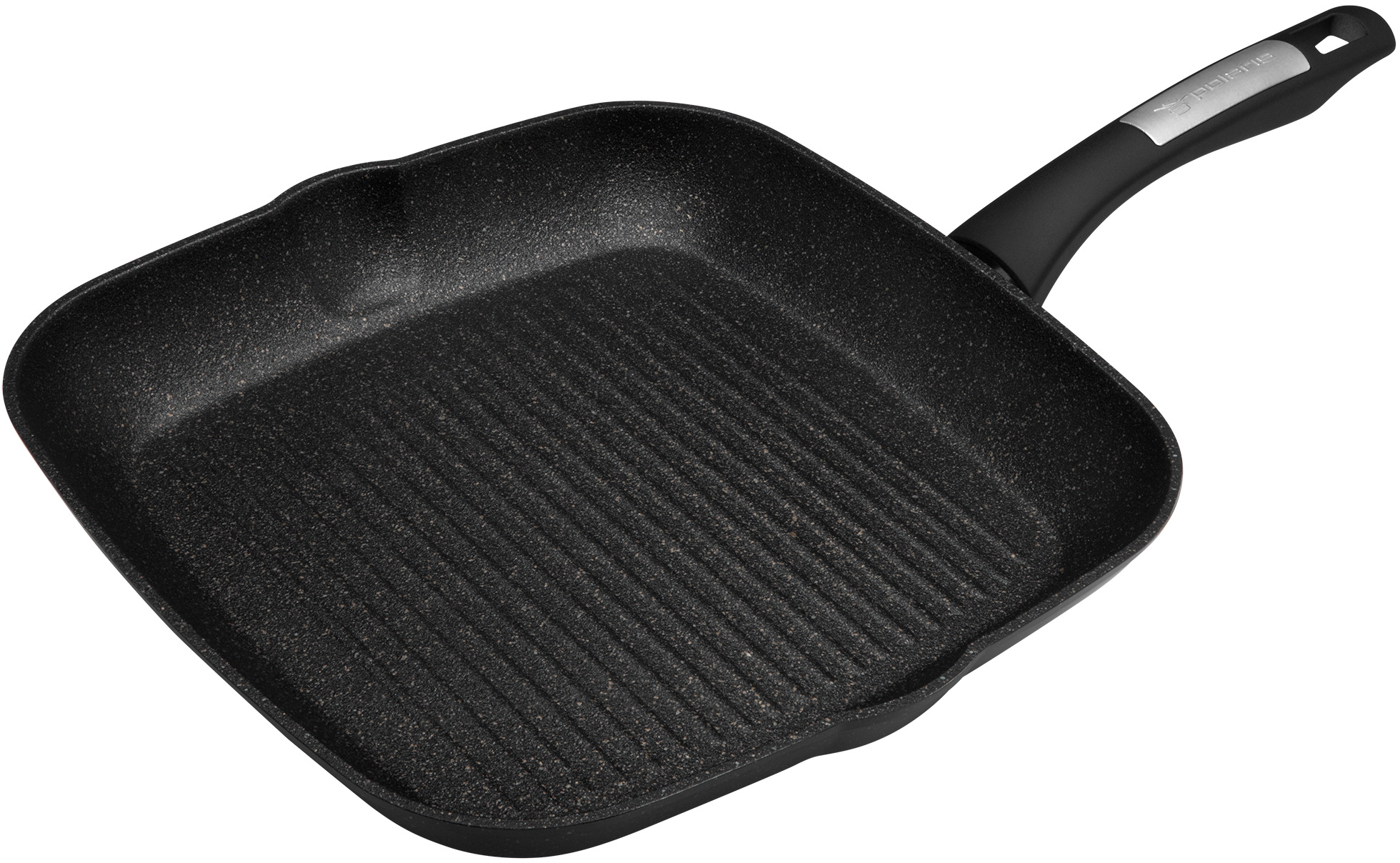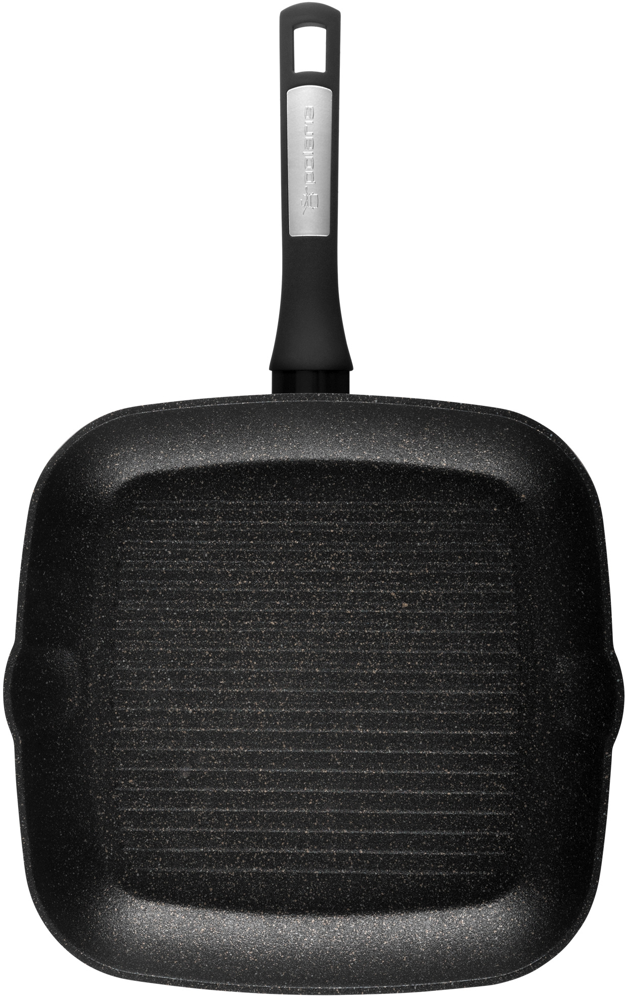 Сковорода-гриль изготовлена из высококачественного кованого алюминия толщиной 3.5мм. Внутреннее покрытие - высокопрочное антипригарное 5-слойное покрытие с керамической крошкой в составе Megastone PRO-5 от компании Dyflon. Эргономичная бакелитовая ручка с покрытием Soft Touch.