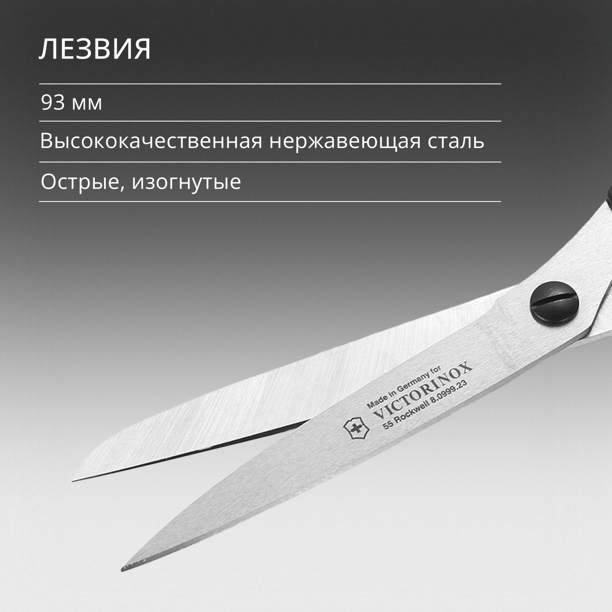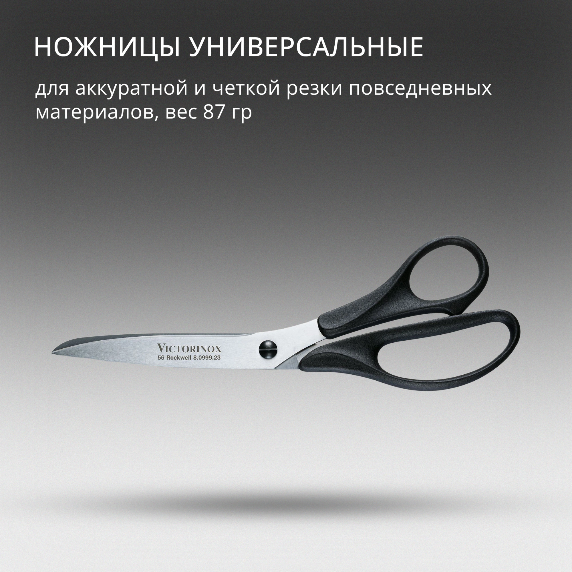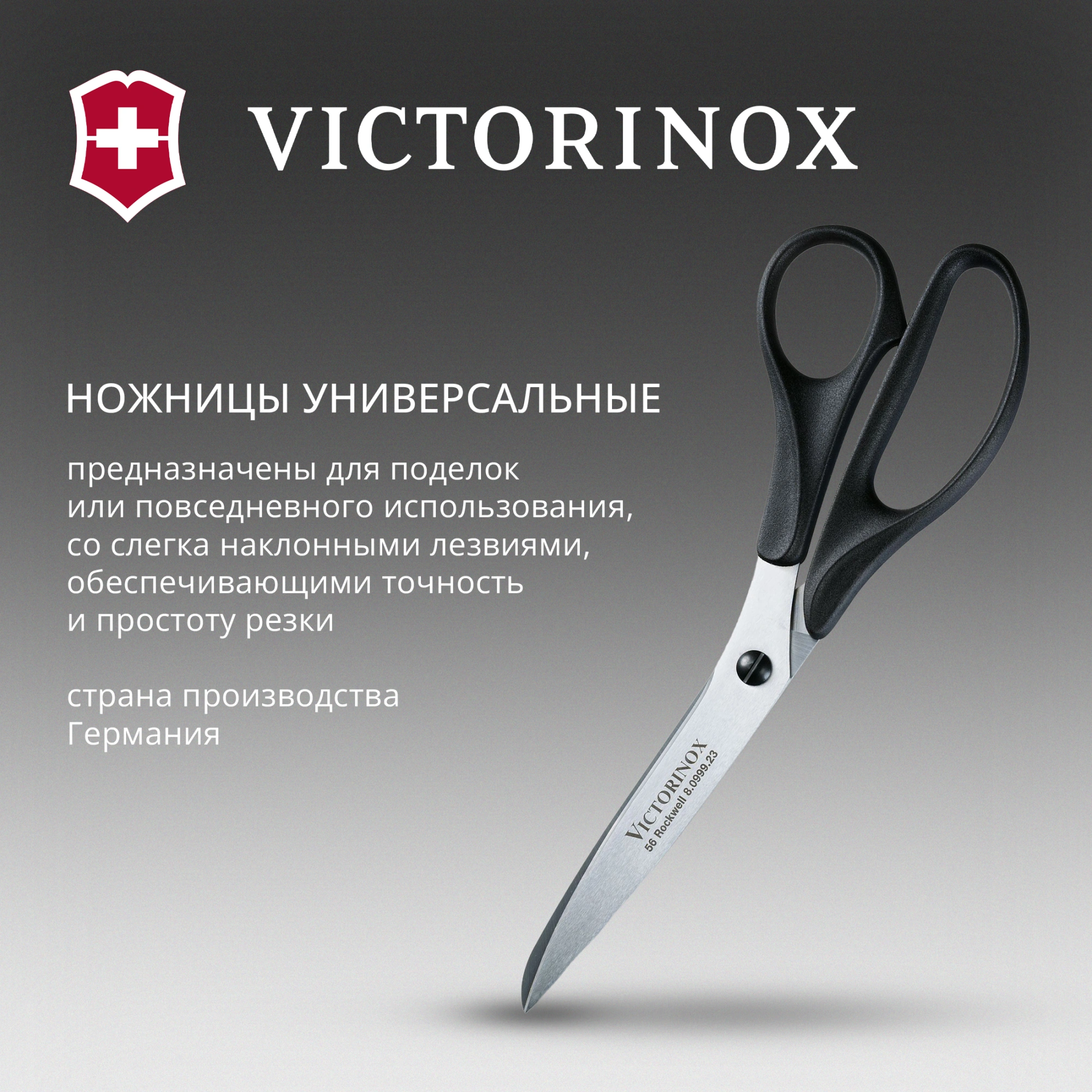 Универсальные ножницы предназначены для поделок или повседневного использования и являются настоящими универсальными ножницами со слегка наклонными лезвиями, обеспечивающими точность и простоту резки. Используемые для аккуратной и четкой резки повседневных материалов, они изготовлены из нержавеющей стали в Германии и оснащены ручками из синтетического материала, выполненного в простом черном цвете. Универсальные ножницы Victorinox имеют эргономичный вес и размер, подходящие всем и позволяющие выполнять любую работу по резке дома или на рабочем месте.