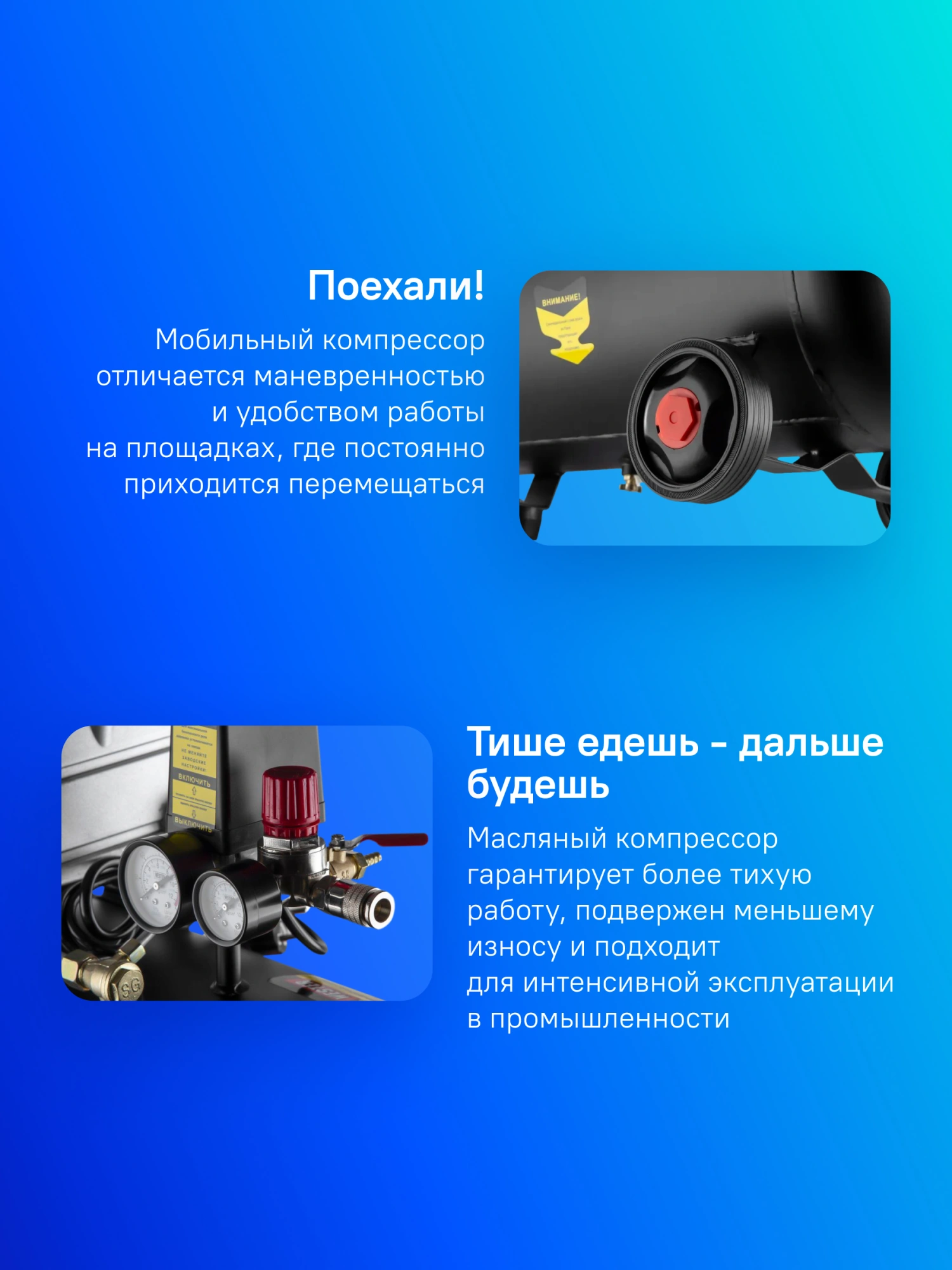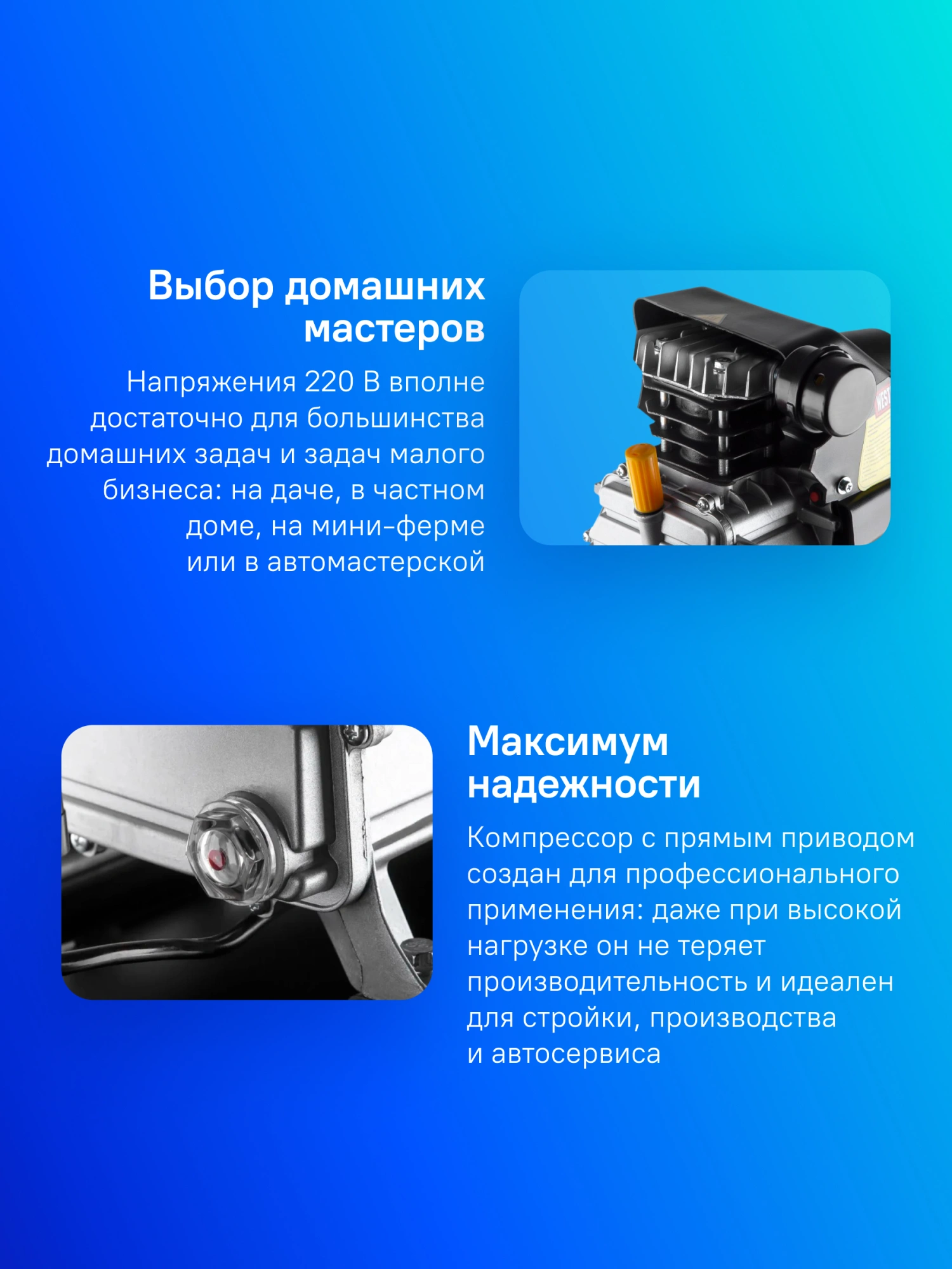 Объем ресивера 50 л. Достаточно для бесперебойной работы большинства инструментов; Мощность 1500 Вт. Компрессор быстро нагнетает воздух; Максимальная производительность 190 л/мин, давление – 8 бар. Подойдет для техники с повышенными требованиями к расходу воздуха.