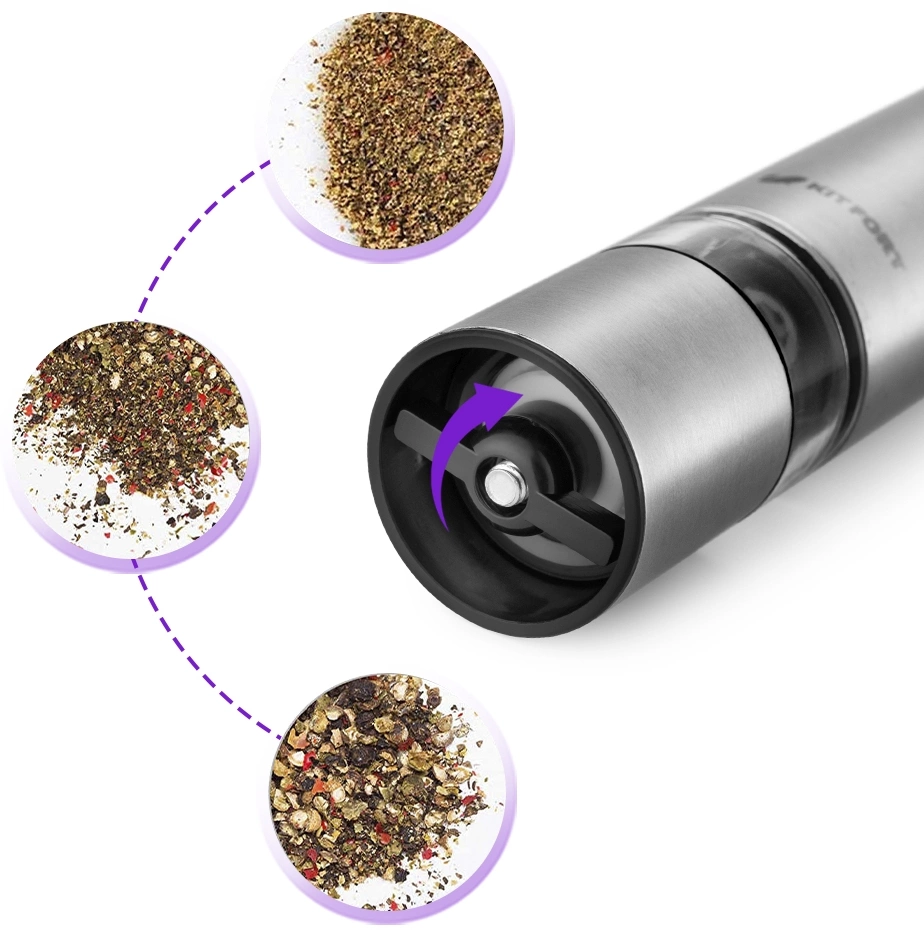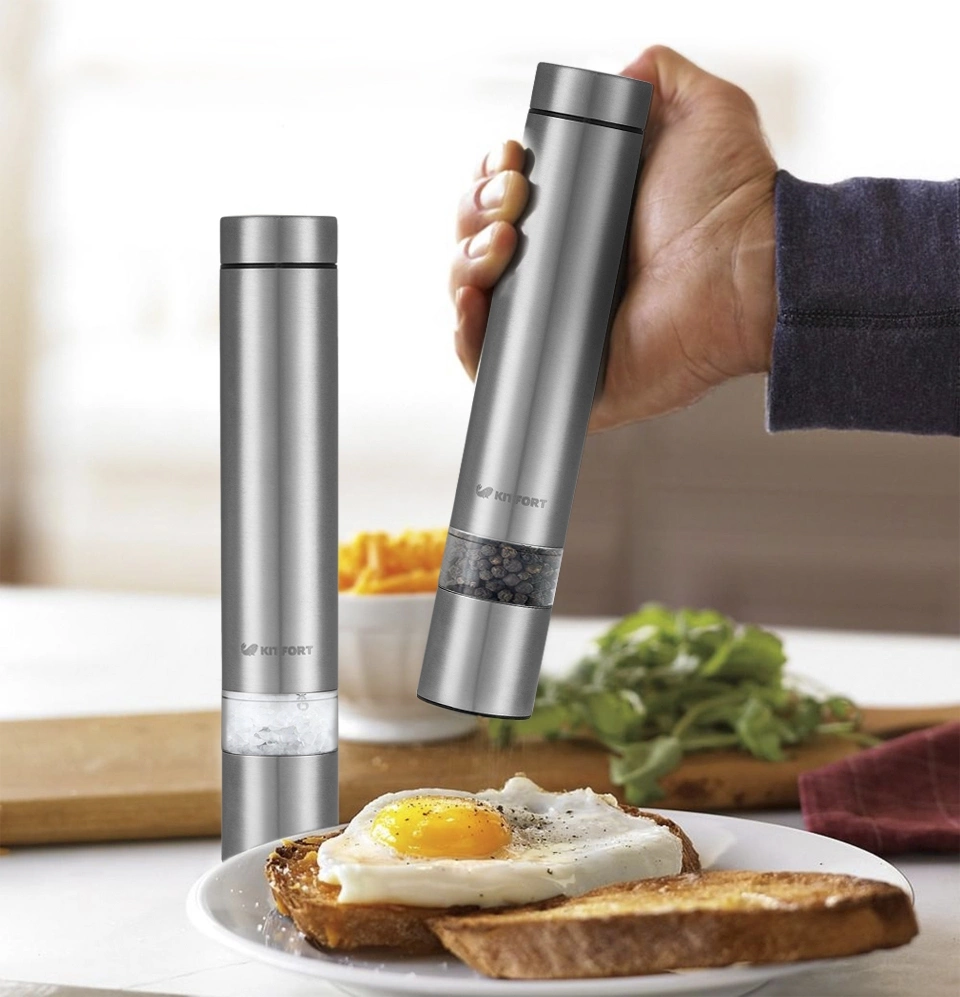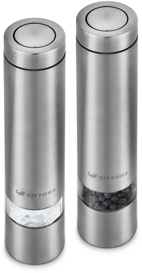 Набор мельниц Kitfort KT-2028 измельчает перец-горошек, соль и другие специи. Нет нужды молоть специи впрок. Мельница одновременно мелет и дозирует. Поместите её над блюдом и просто нажмите кнопку.