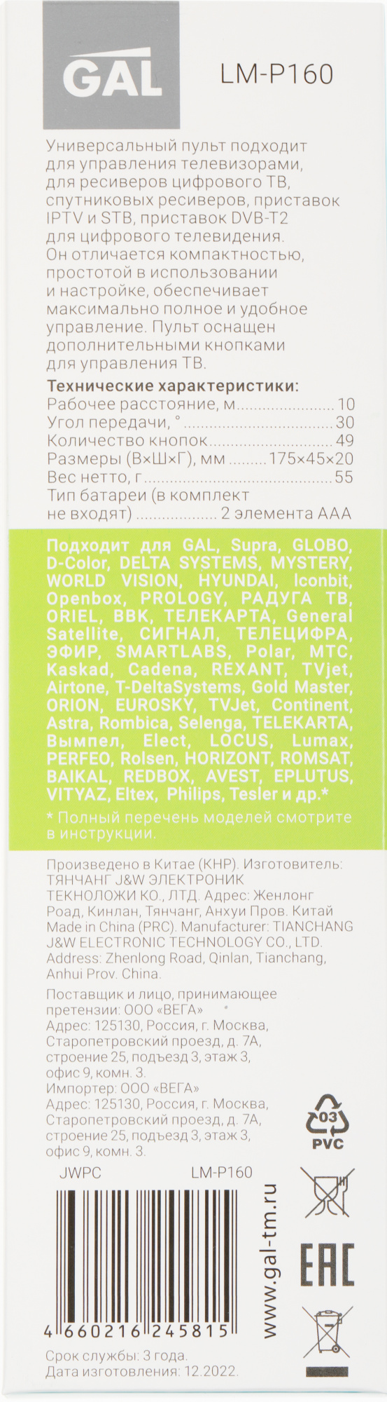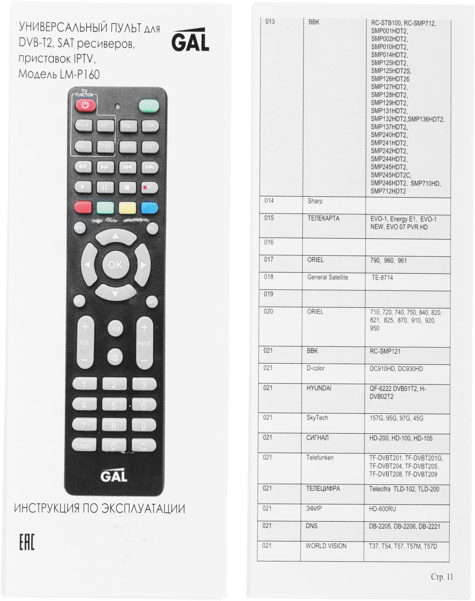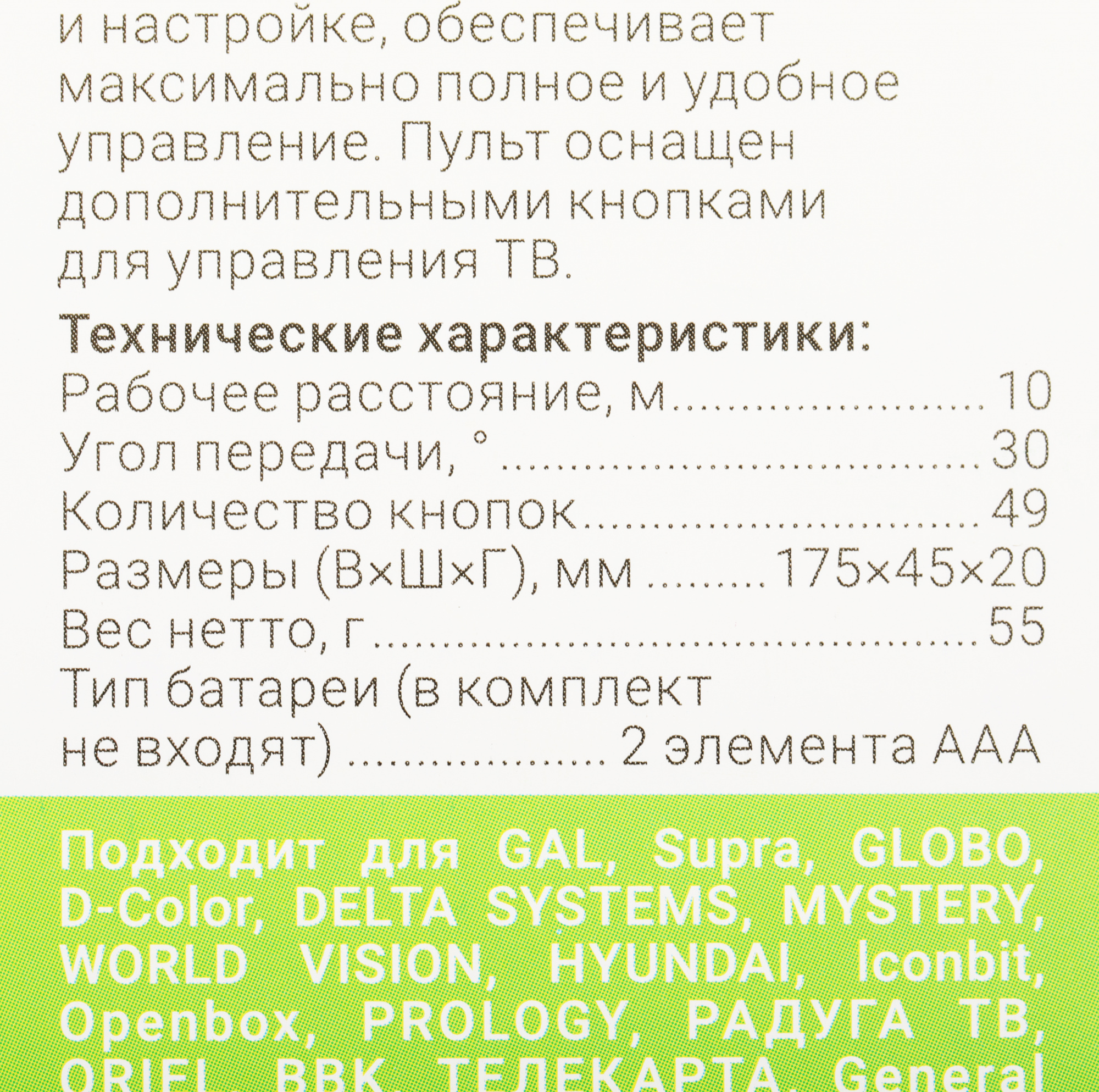 Пульт предназначен для замены вышедшего из строя или утраченного штатного пульта. Он подходит для большинства ресиверов цифрового ТВ, а также некоторых моделей спутниковых ресиверов, приставок IPTV и STB, распространённых на территории России и в странах СНГ.