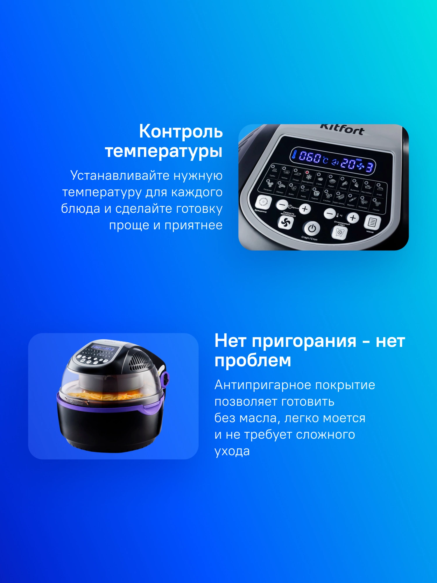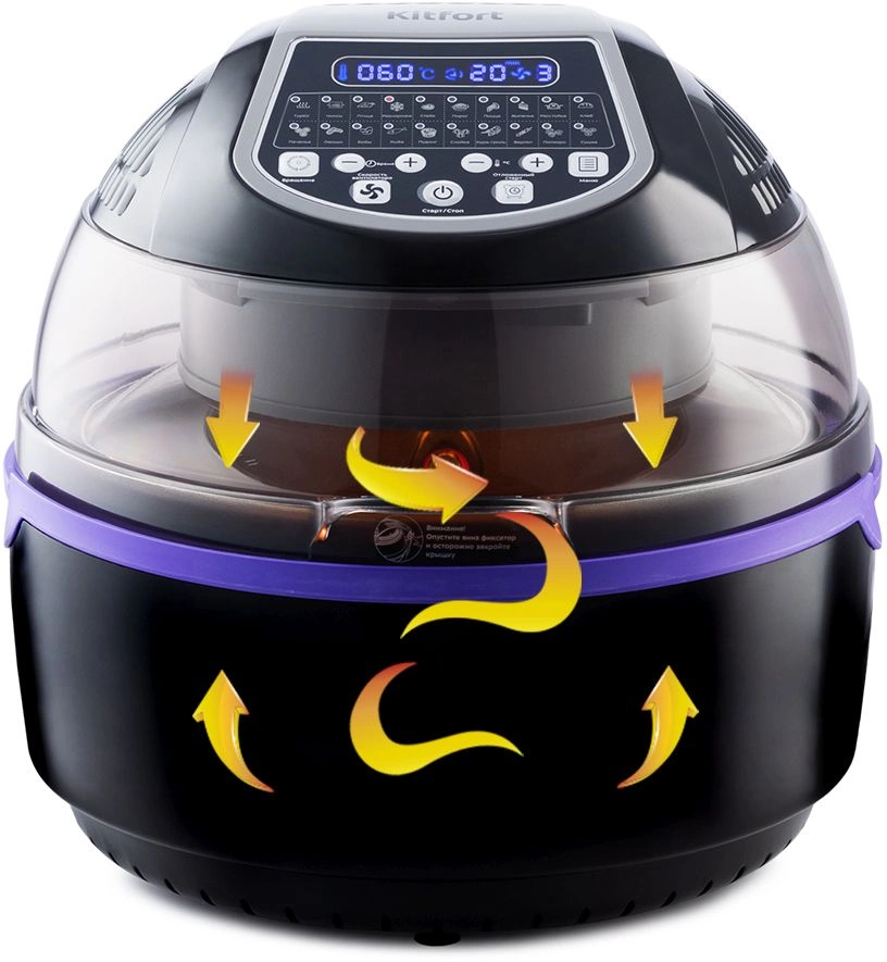 Современный классический аэрогриль Kitfort КТ-2219 замечателен стильным дизайном, а также позволяет готовить большинство продуктов без добавления масла. Например, картошку, мясо, рыбу, птицу, овощи, выпечку и многое другое.