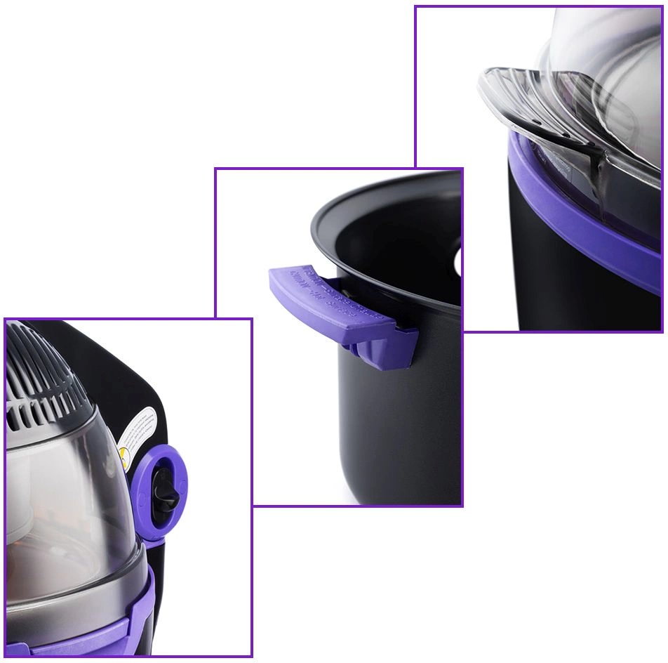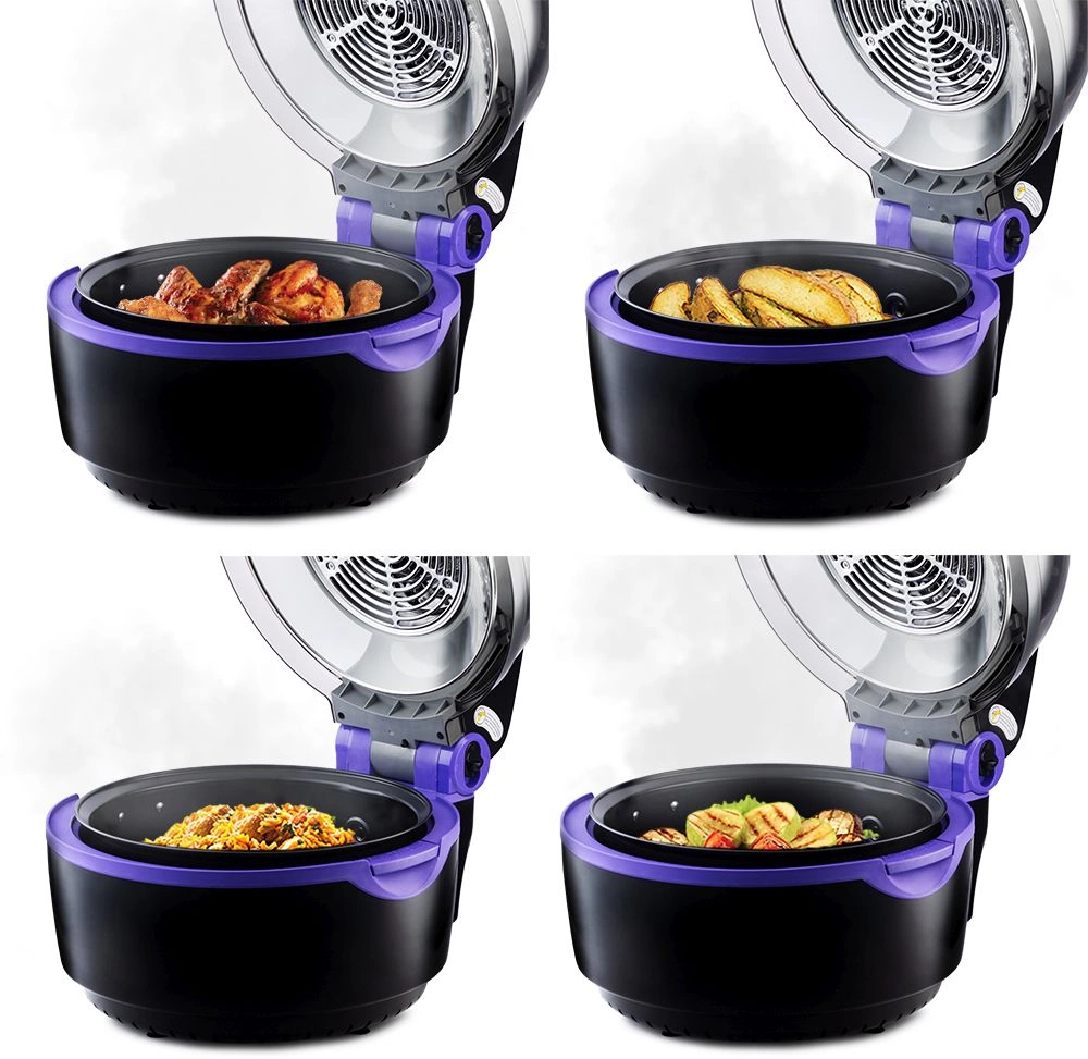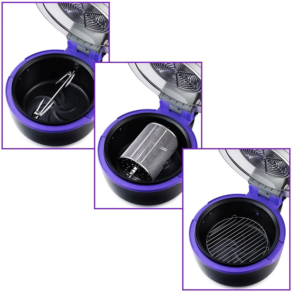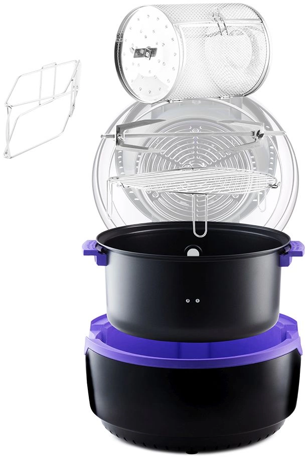 Вентилятор, расположенный в верхней части аэрогриля, обеспечивает циркуляцию горячего воздуха от нагревателя внутри рабочей ёмкости. Тем самым, продукты равномерно обжариваются со всех сторон, получаются нежными внутри и с хрустящей корочкой снаружи.