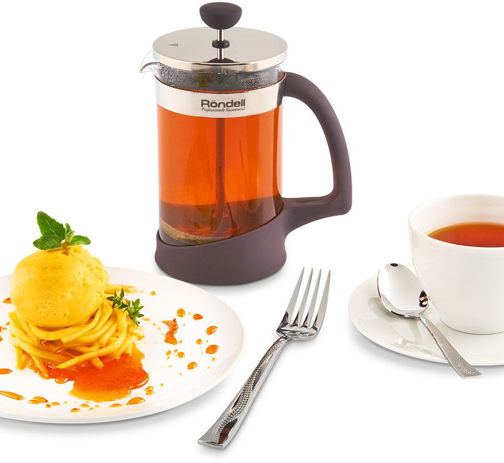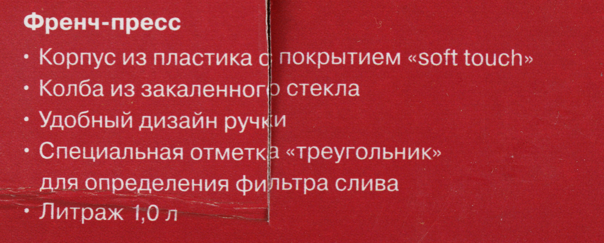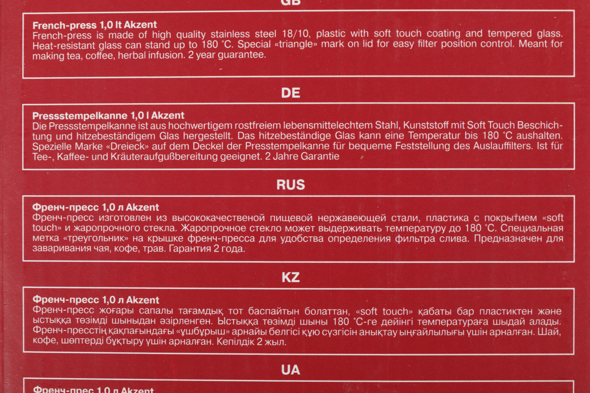 Колба Френч-прессов Akzent изготовлена из высококачественного термостойкого стекла, а держатель из АВС-пластика черничного цвета и нержавеющей стали. Для комфорта в использовании на крышке значок, который «подскажет», где фильтр слива. В коллекции две модели — объемом 1 л и 0,6 л.