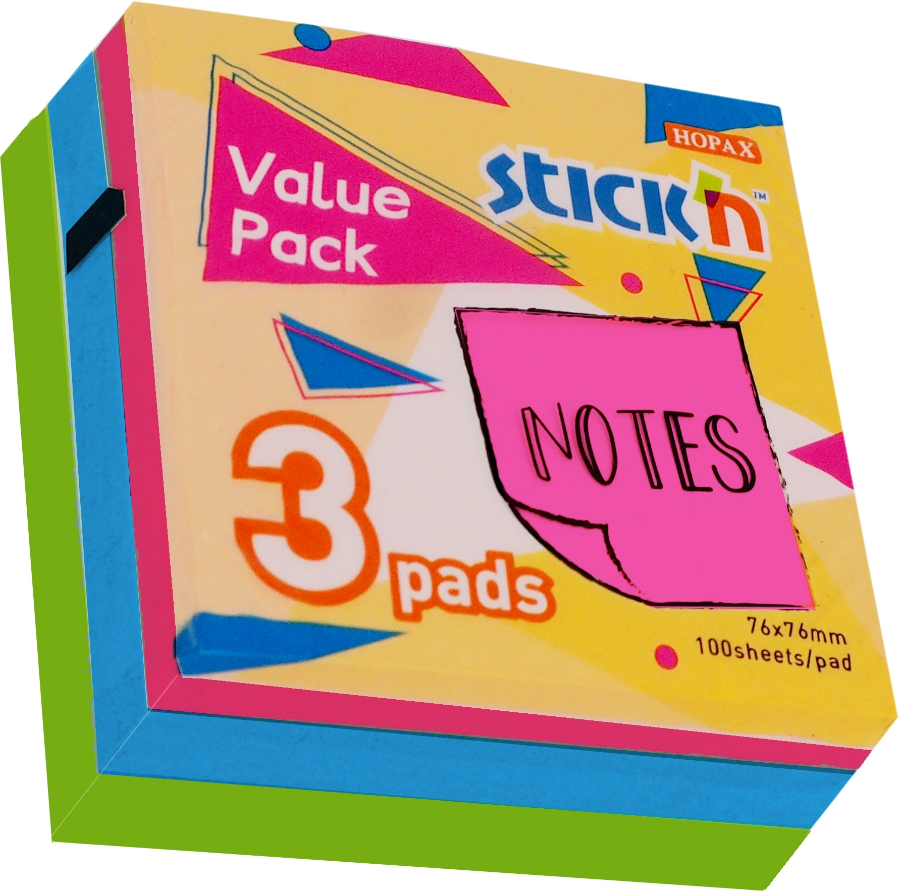 Блок самоклеящийся бумажный Stick`n 27095 76x76мм 100лист. 70г/м2 неон ассорти 3цв.в упак. (упак.:3шт)