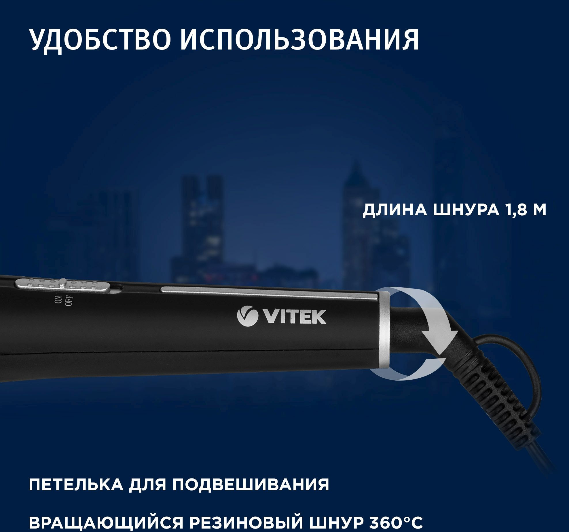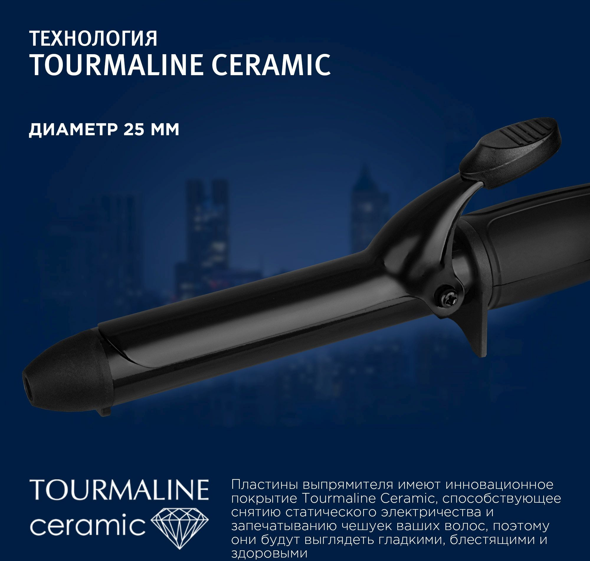 Уложить волосы красивыми ровными локонами помогут электрощипцы VITEK VT-2523 диаметром 25 мм. Поверхность рабочей части устройства имеет покрытие Tourmaline Ceramic, которое снимает статическое электричество и «запечатывает» чешуйки волос, благодаря чему они выглядят блестящими и здоровыми. Этому же результату способствует технология PTC Heating, позволяющая быстро стабилизировать нагрев прибора (максимальная температура — 200 °С). Особому удобству в использовании электрощипцов обеспечивает вращающийся на 360 °С резиновый шнур длиной 1,8 м.