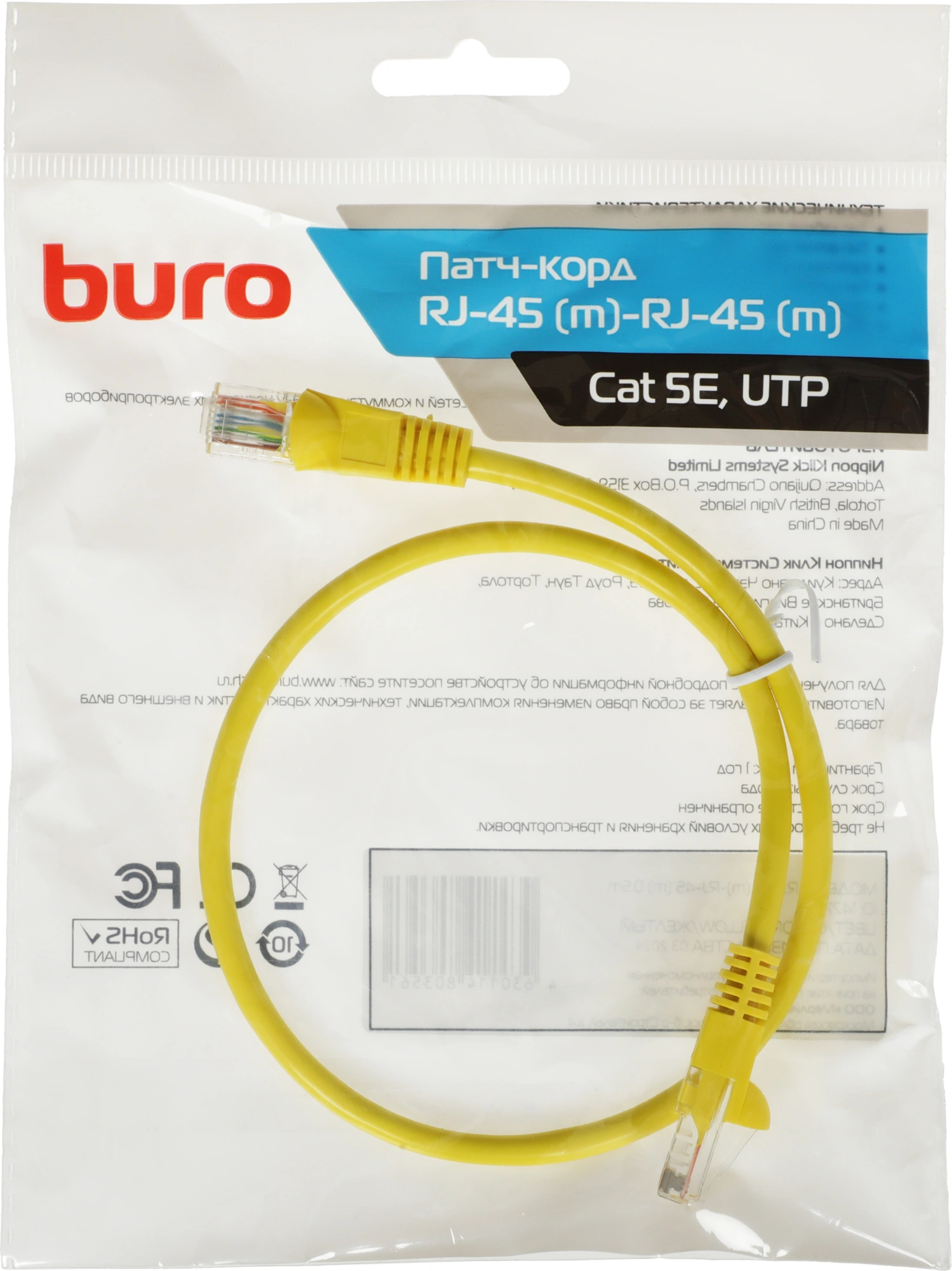 Патч-корд Buro UTP 4 пары cat.5E CCA molded 0.5м желтый RJ-45 (m)-RJ-45 (m) (UTP-5E-0,5M-Y)