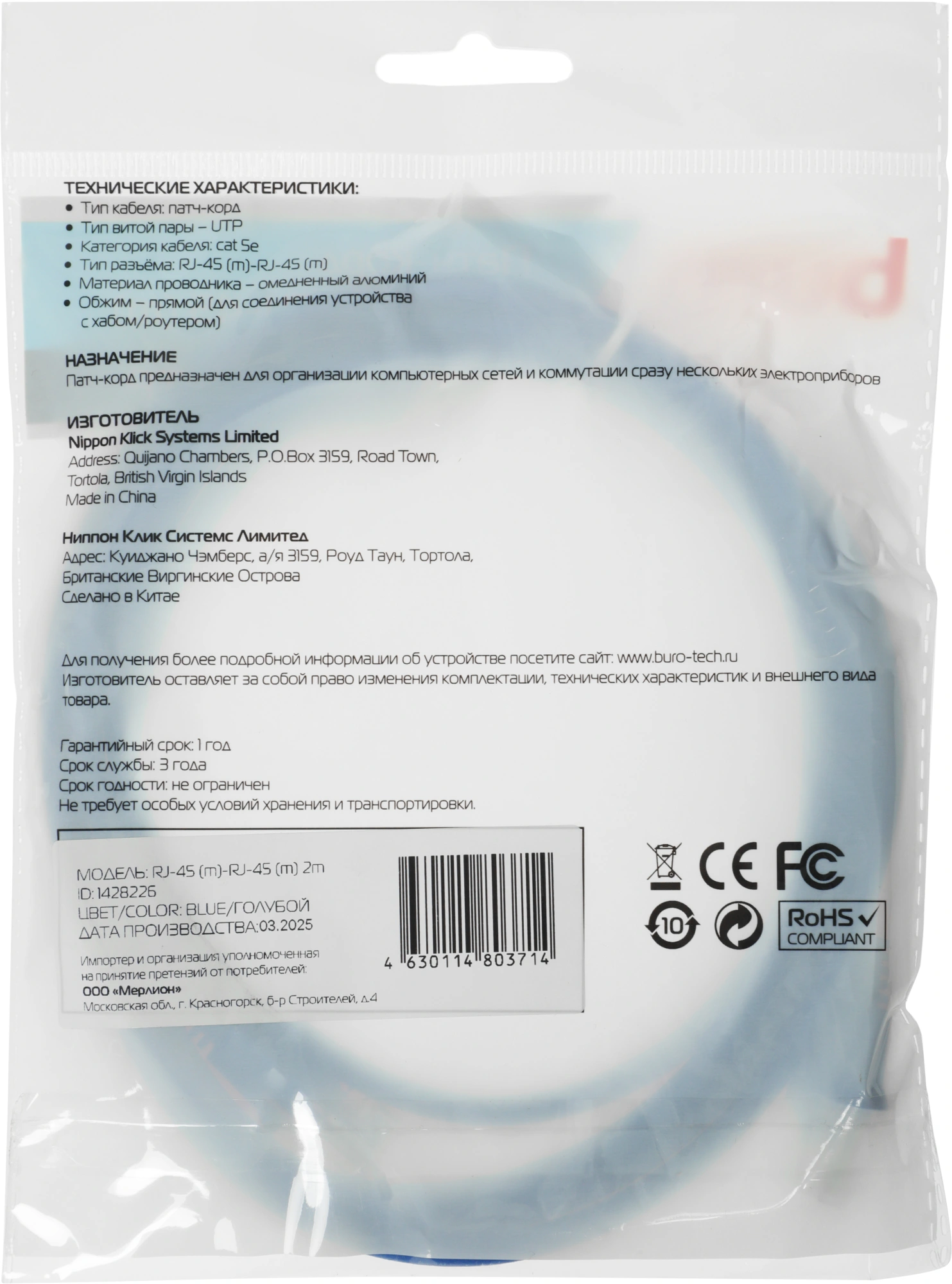 Патч-корд Buro UTP-5E-2M-BL