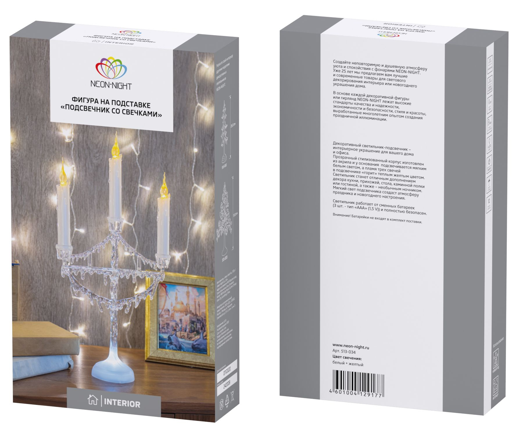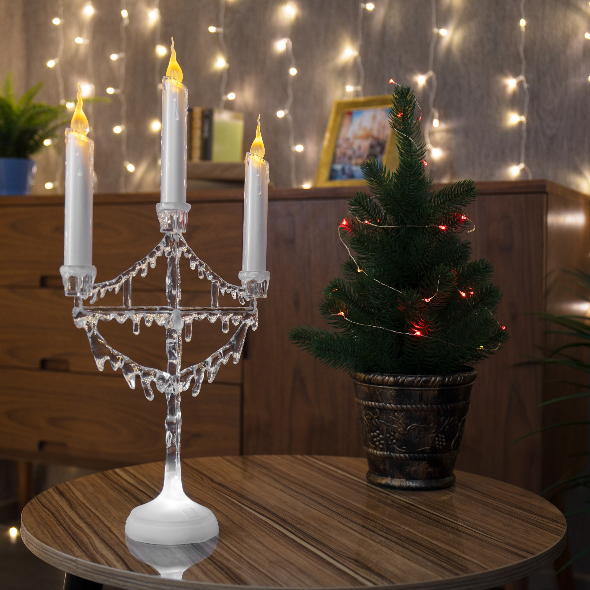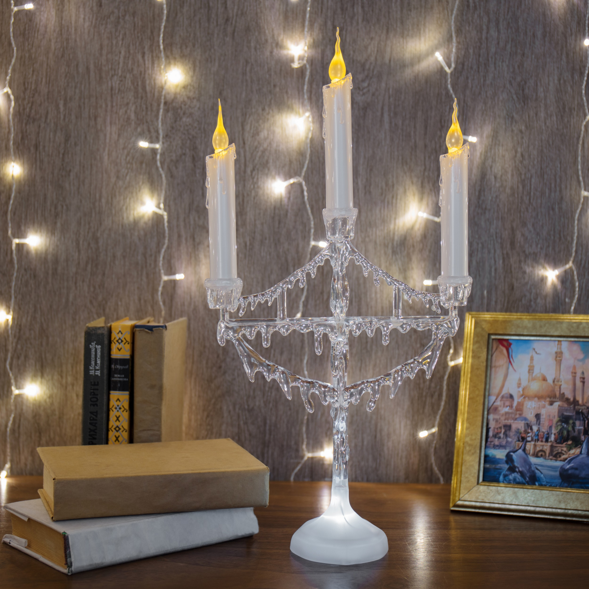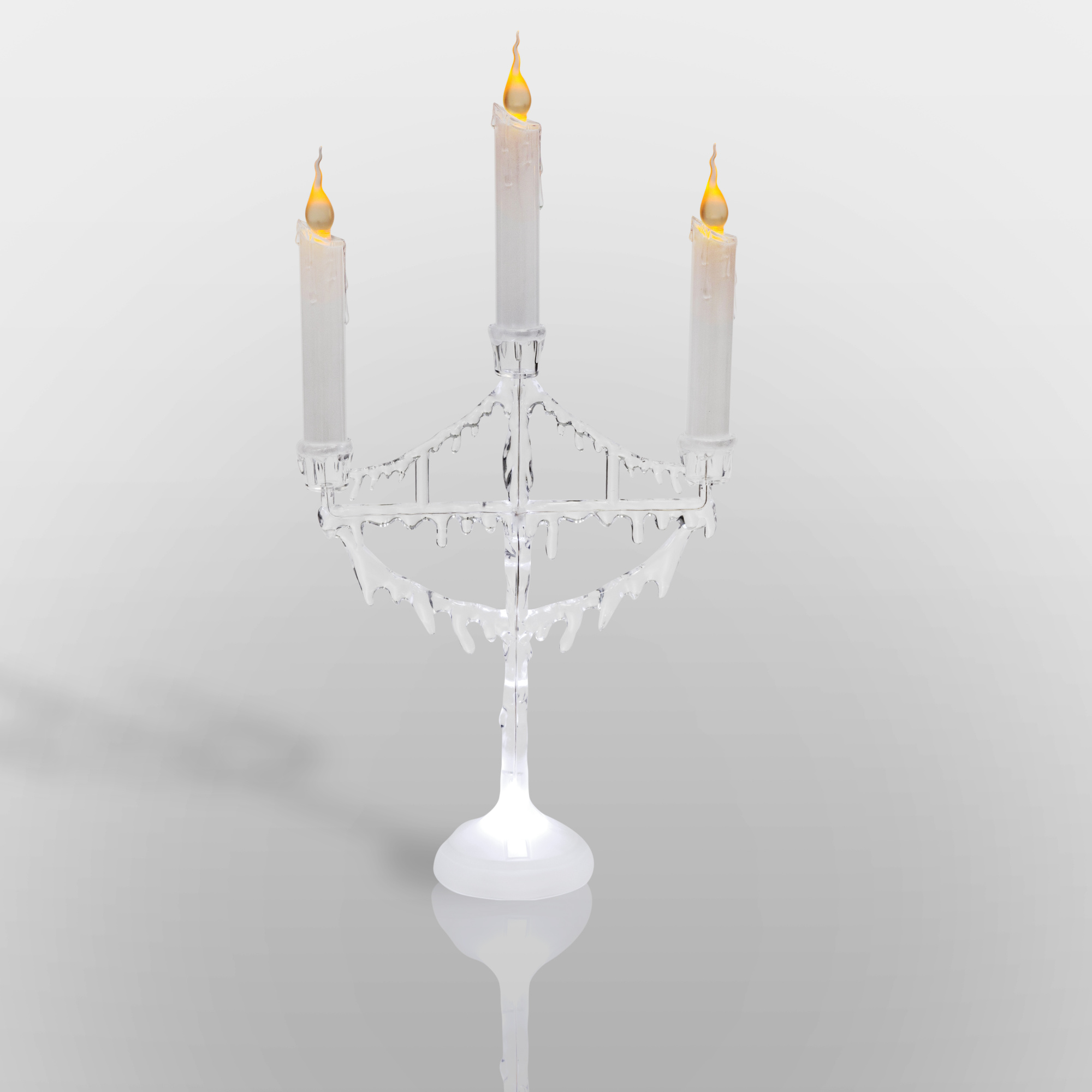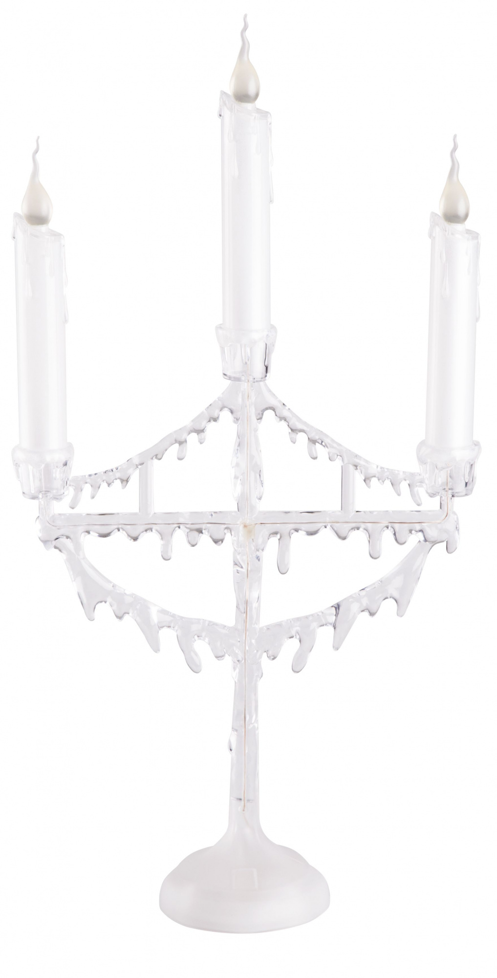 Портативный подсвечник предназначен для оформления интерьера в помещении. Может использоваться в качестве ночника: при работе бесшумен. Свечи с подтаявшим воском и ярким пламенем напоминают настоящие. Долговечные диоды мягкого холодного сияния не нагреваются и минимально расходуют электроэнергию.
