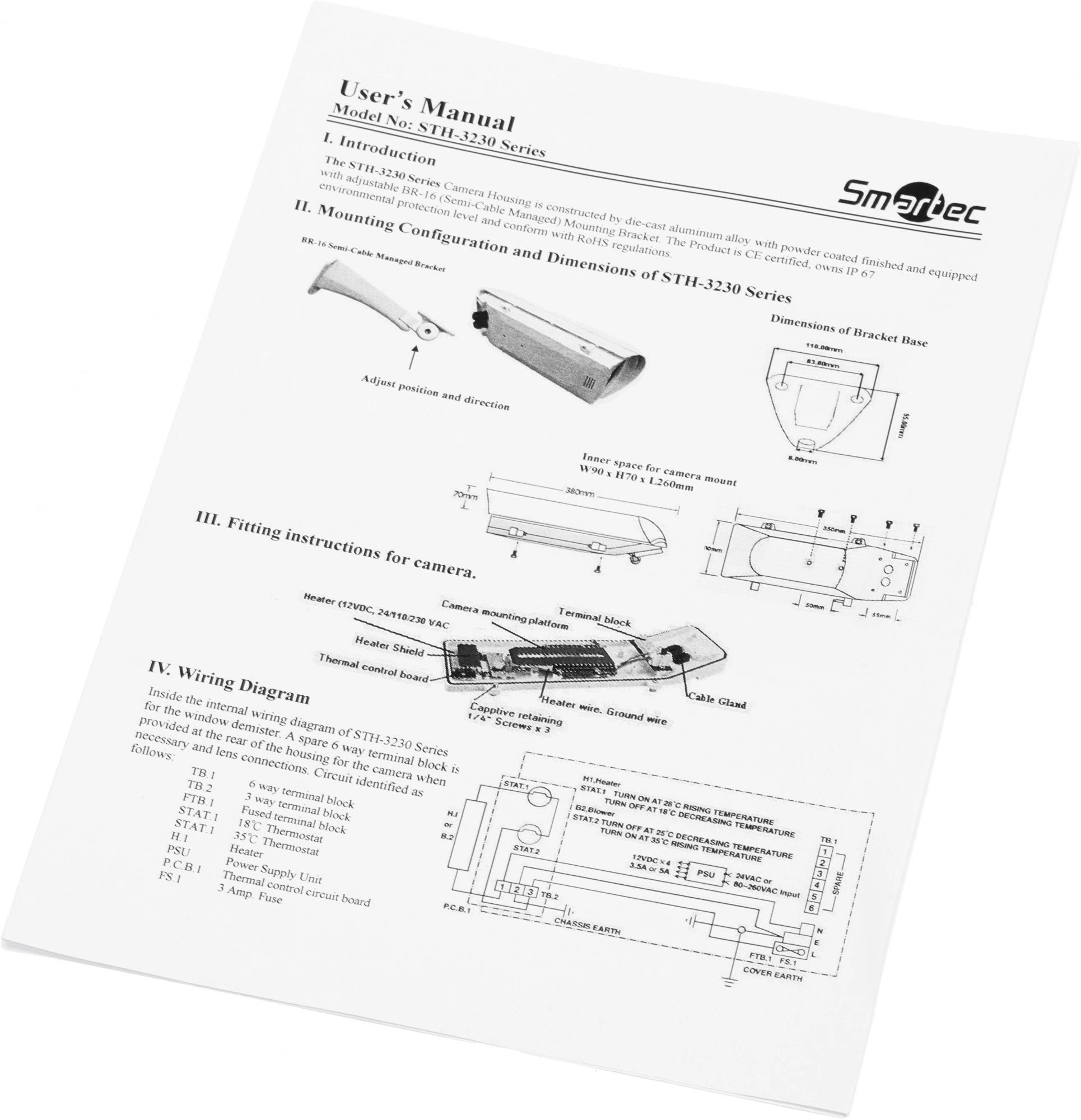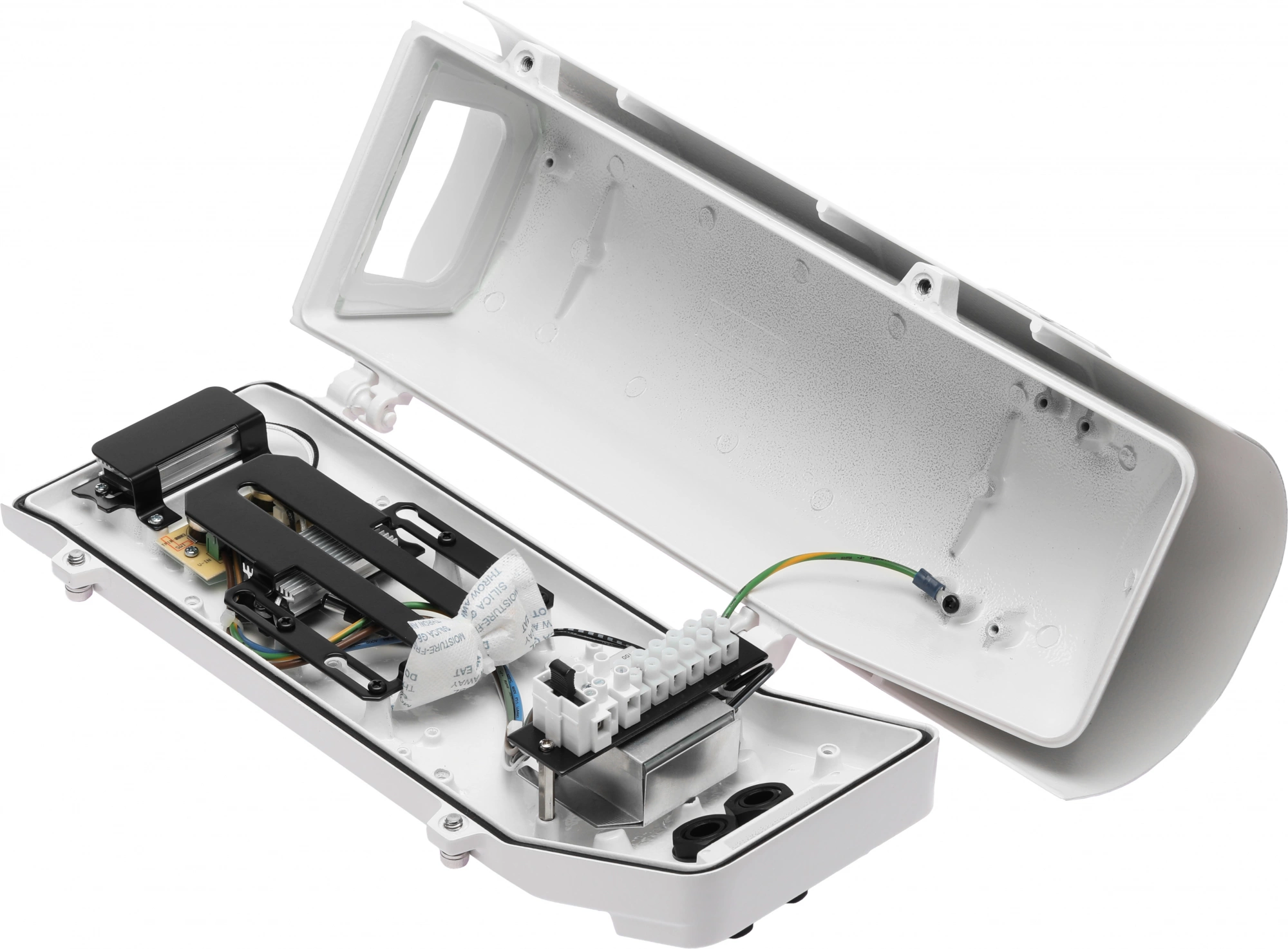 Термокожух (90x70x260 мм) с 2 обогревателями, солнцезащитным козырьком и настенным кронштейном (частичная сквозная проводка); боковое открывание верхней части корпуса, встроенный источник электропитания для видеокамеры 12B(DC)/1А