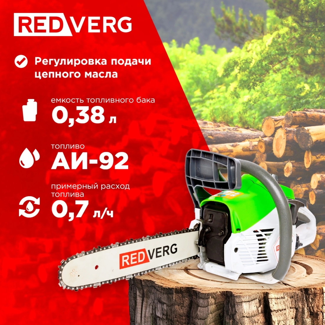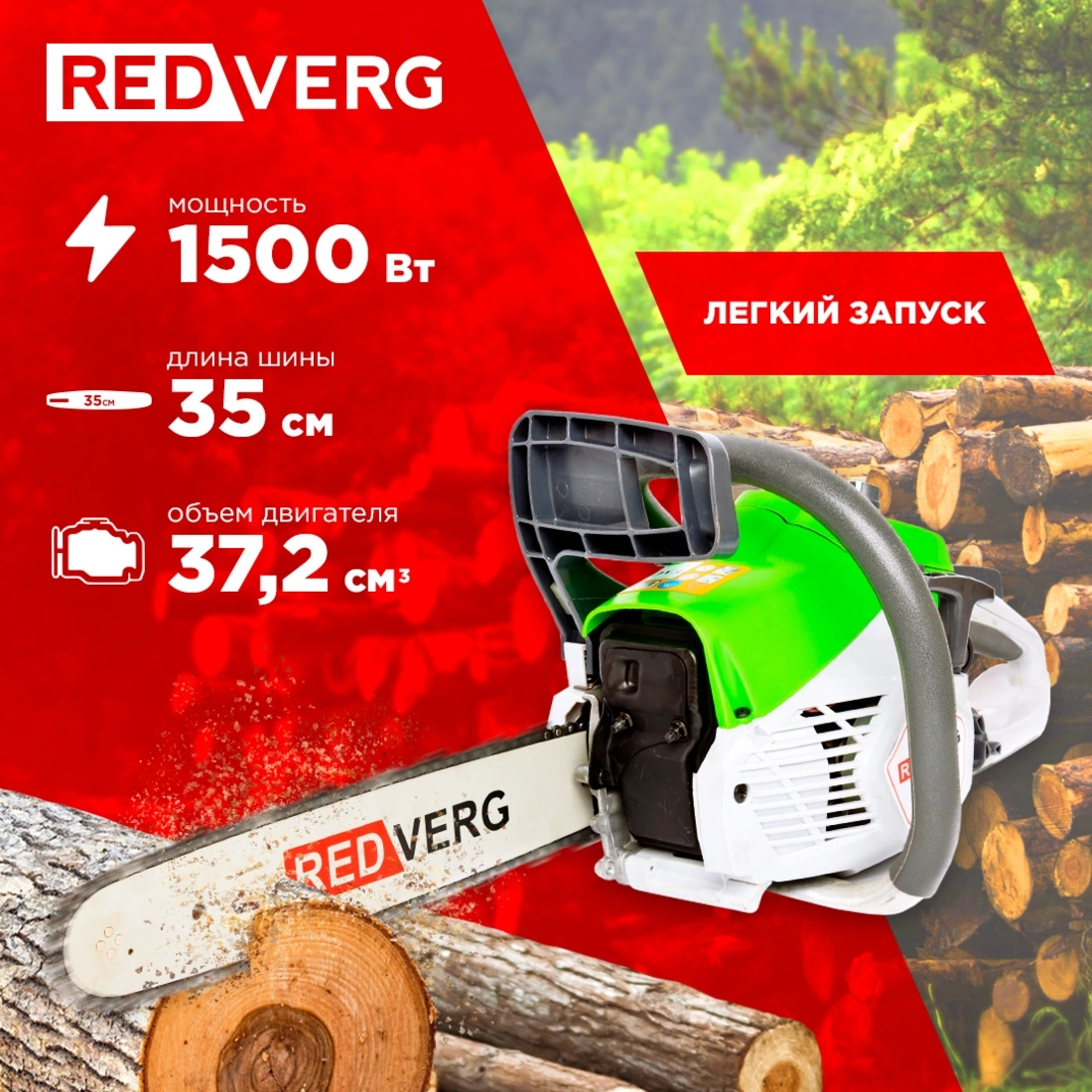 Лёгкая компактная бензопила, мощностью 1,5 кВт, с шиной длиной 35см, позволит выполнять работы по спиливанию деревьев в саду и на загородном участке, а также при распиливании и заготовки дров на зиму.
