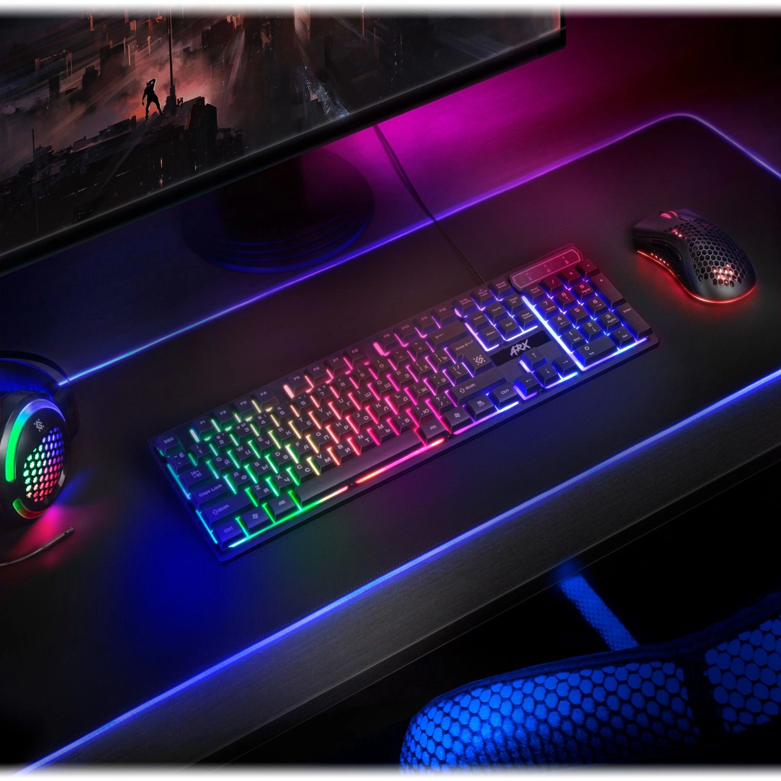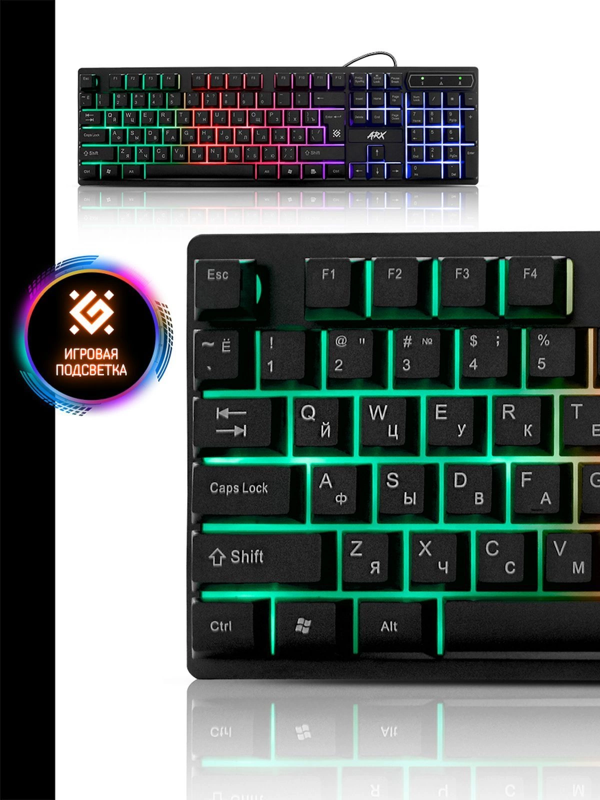 Радужная подсветка. Возможность выключения подсветки. Увеличенная площадь клавиш-модификаторов (Ctrl, Shift), клавиш Enter и BackSpace. Угол наклона клавиатуры регулируется с помощью ножек.