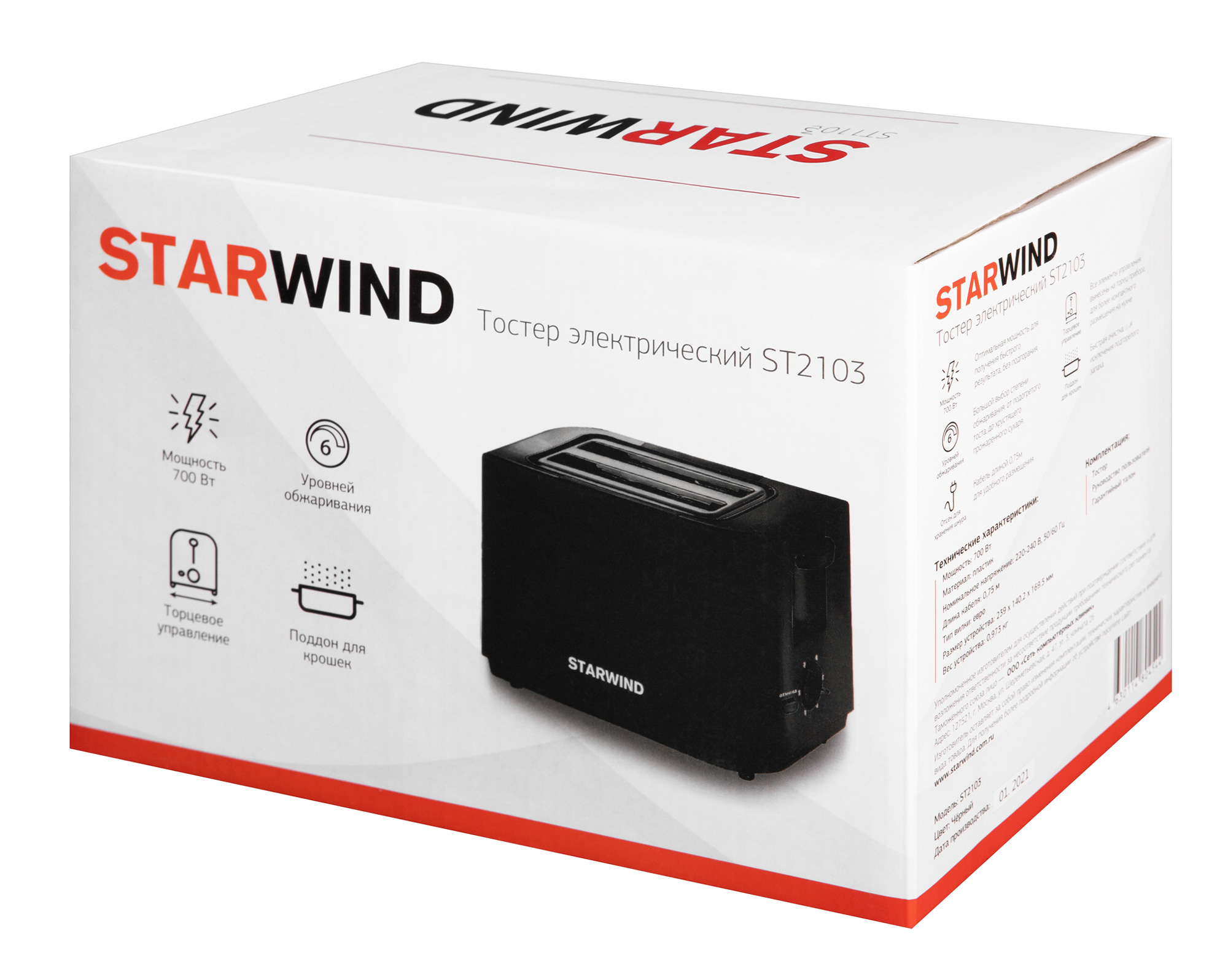 Тостер Starwind ST2103 – компактный бытовой прибор для кухонного пространства. С помощью такого устройства ломтики хлеба прожариваются буквально за пару минут. Мощность тостера находится на уровне 700 Вт. Здесь предусмотрена механическая система управления, с которой разберется каждый человек, имеется два отделения для хлеба. Конструктивно предусмотрен бесступенчатый терморегулятор, есть выдвижной лоток для удаления крошек. Выполнен девайс в черном цвете, использован качественный пластик.