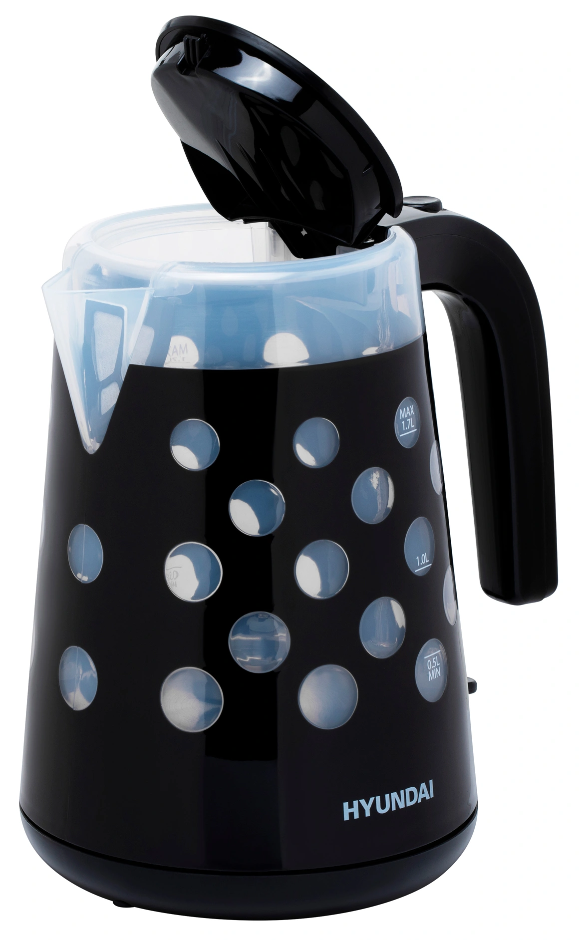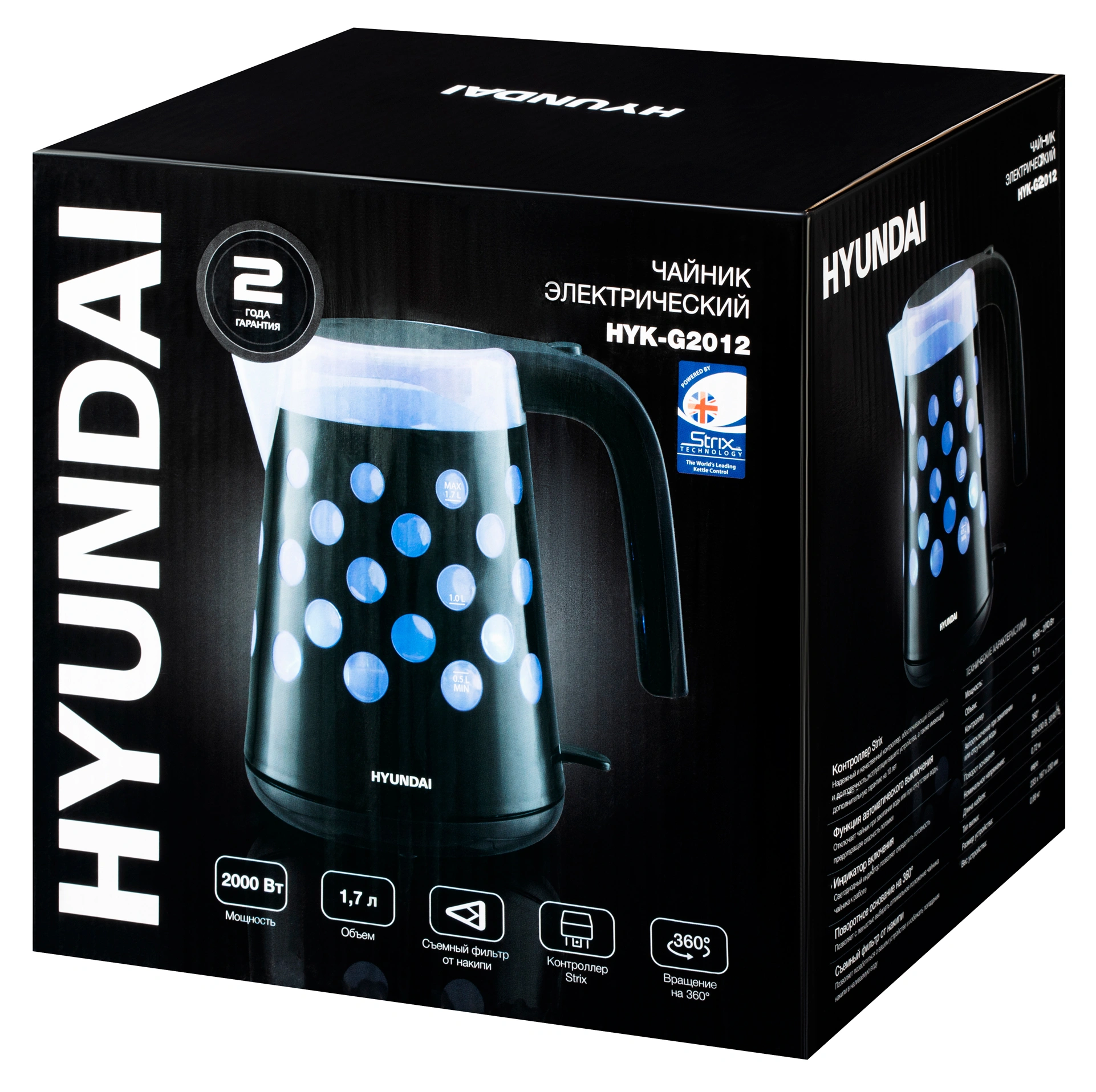 Электрический чайник Hyundai HYK-G2012 – это практически незаменимая бытовая техника, существенно упрощающая жизнь современной хозяйки. Устройство выполнено в уникальном дизайне, сразу привлекающем к себе внимание. Мощность составляет порядка 2000 Ватт, а объем резервуара для жидкости равен 1,7 литра. В конструкции электрического чайника предусмотрен нагревательный элемент скрытого типа. Корпус изготавливается на основе термически устойчивого пластика, выполнен в классическом черном цвете. Здесь предусмотрены индикатор включения и уровня жидкости, подсветка и фильтр, препятствующий формированию накипи.