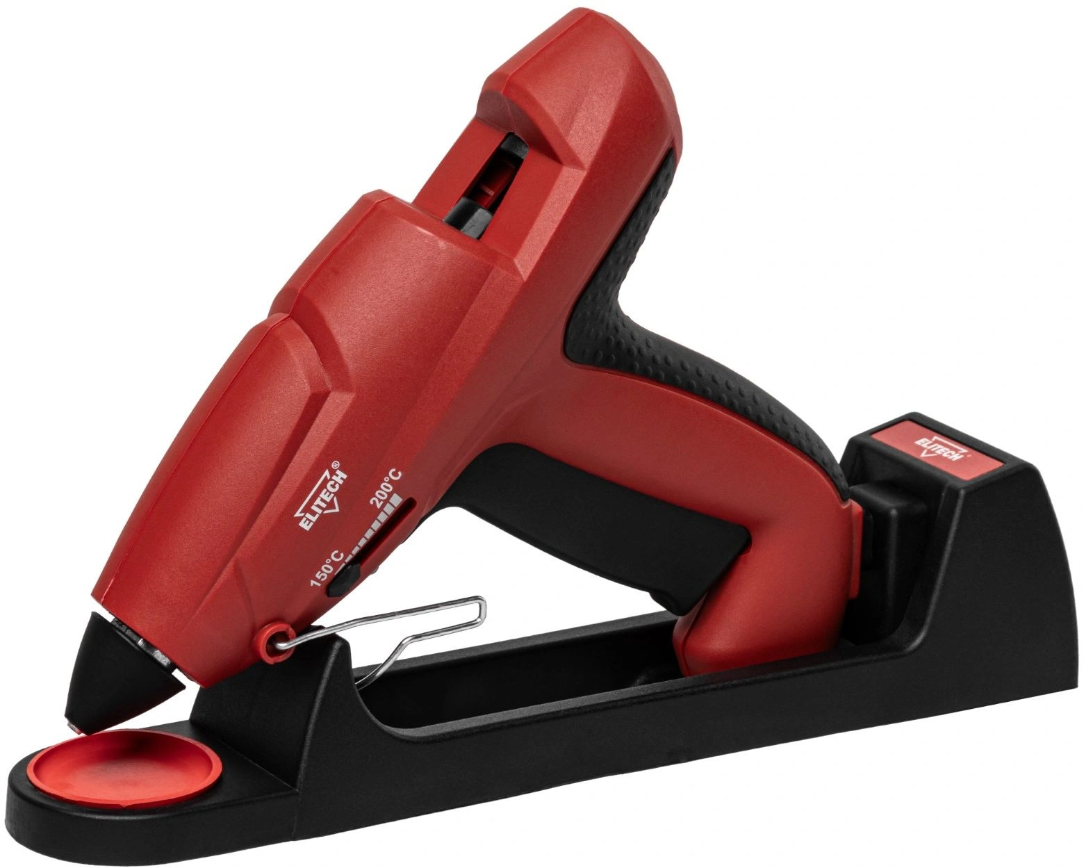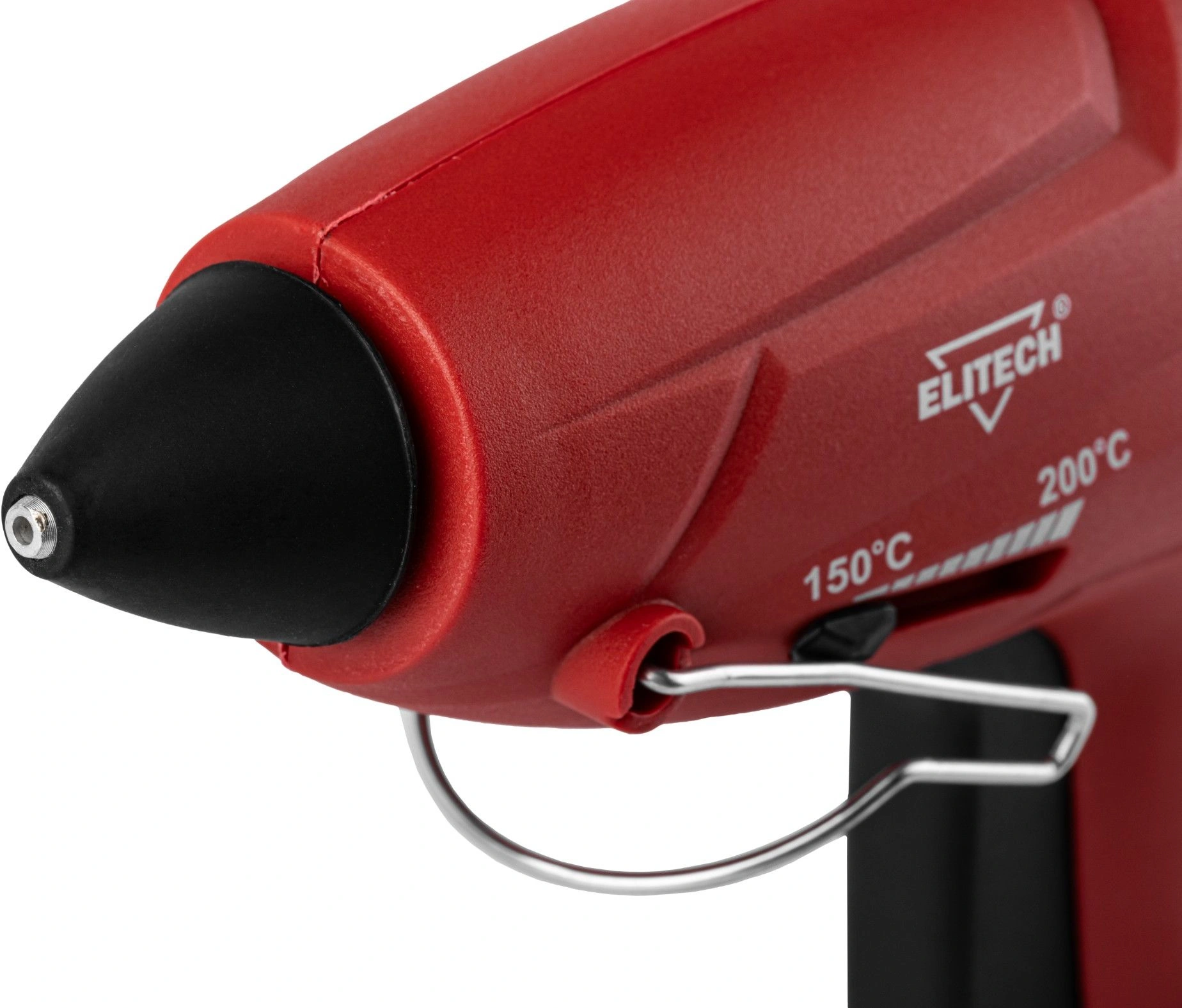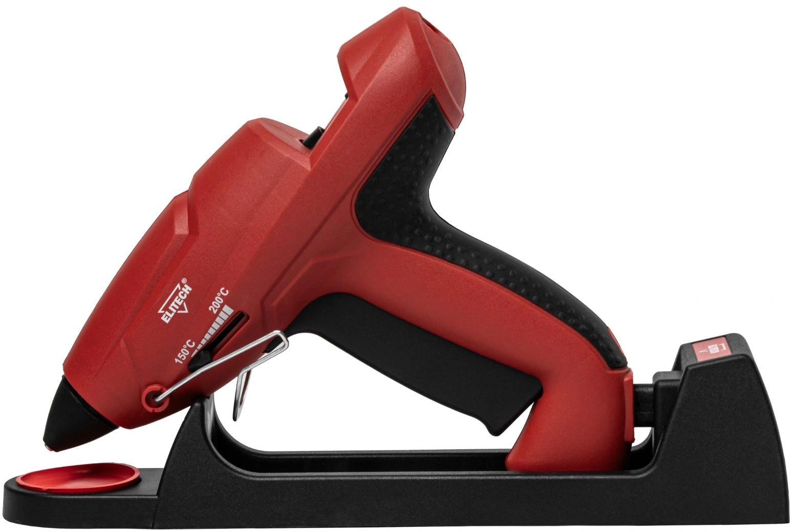 Регулировка температуры. Беспроводной пистолет. Удобная складная подставка на пистолете. Стационарная подставка с блоком питания. Визуальный контроль остатка клеевого стержня. Термоизолирующая насадка сопла. Эргономичная нескользящая рукоятка.