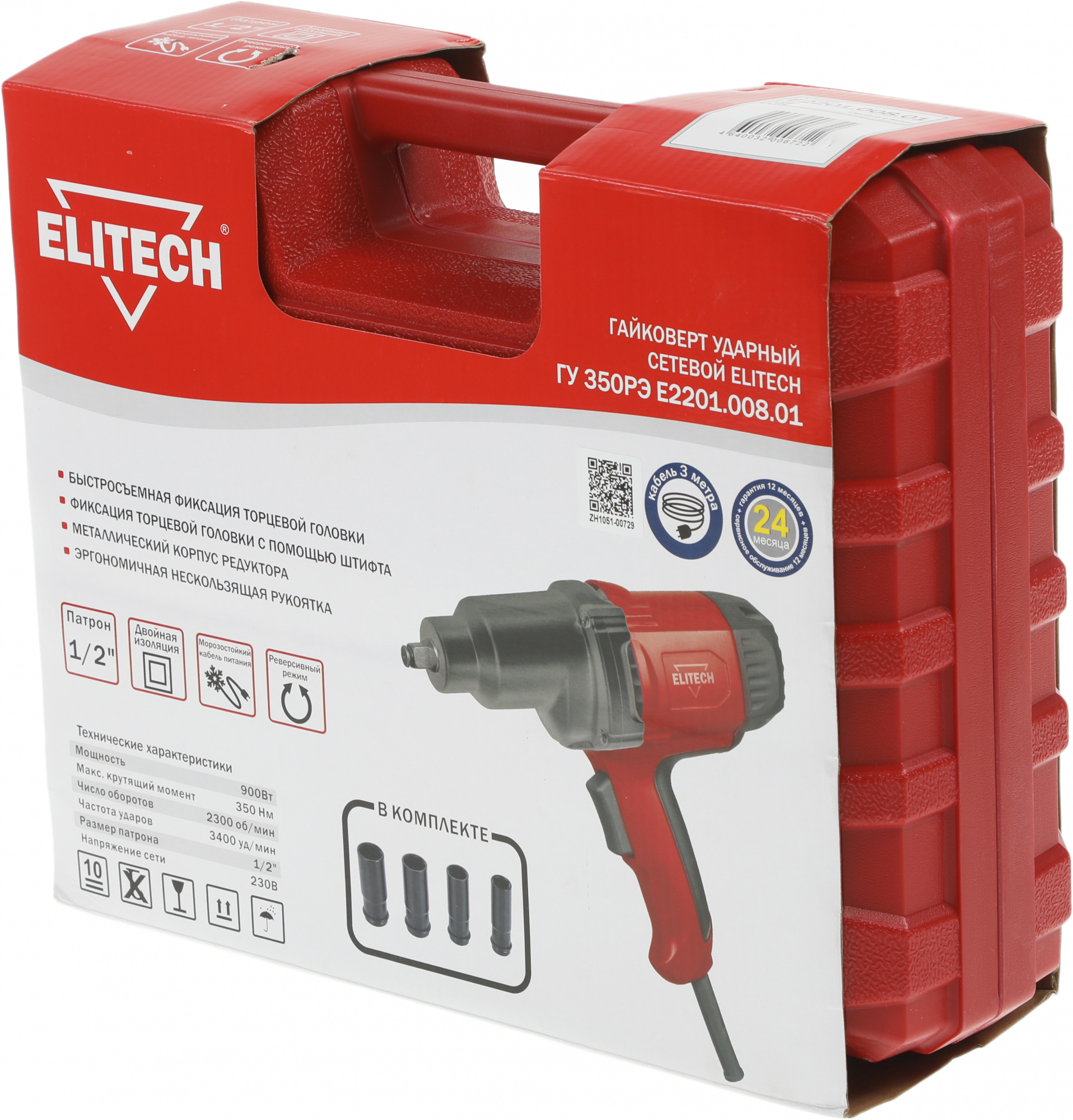 Быстросъемная фиксация торцевой головки. Фиксация торцевой головки с помощью штифта. Металлический корпус редуктора. Эргономичная нескользящая рукоятка. Морозостойкий кабель питания.