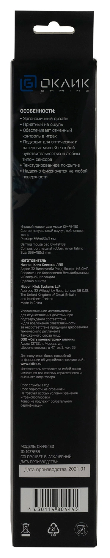 С размерами 450x350x3мм OK-F0450 даёт много места для комфортной работы с мышью, позволяя свободно перемещать ее по поверхности без ограничений.