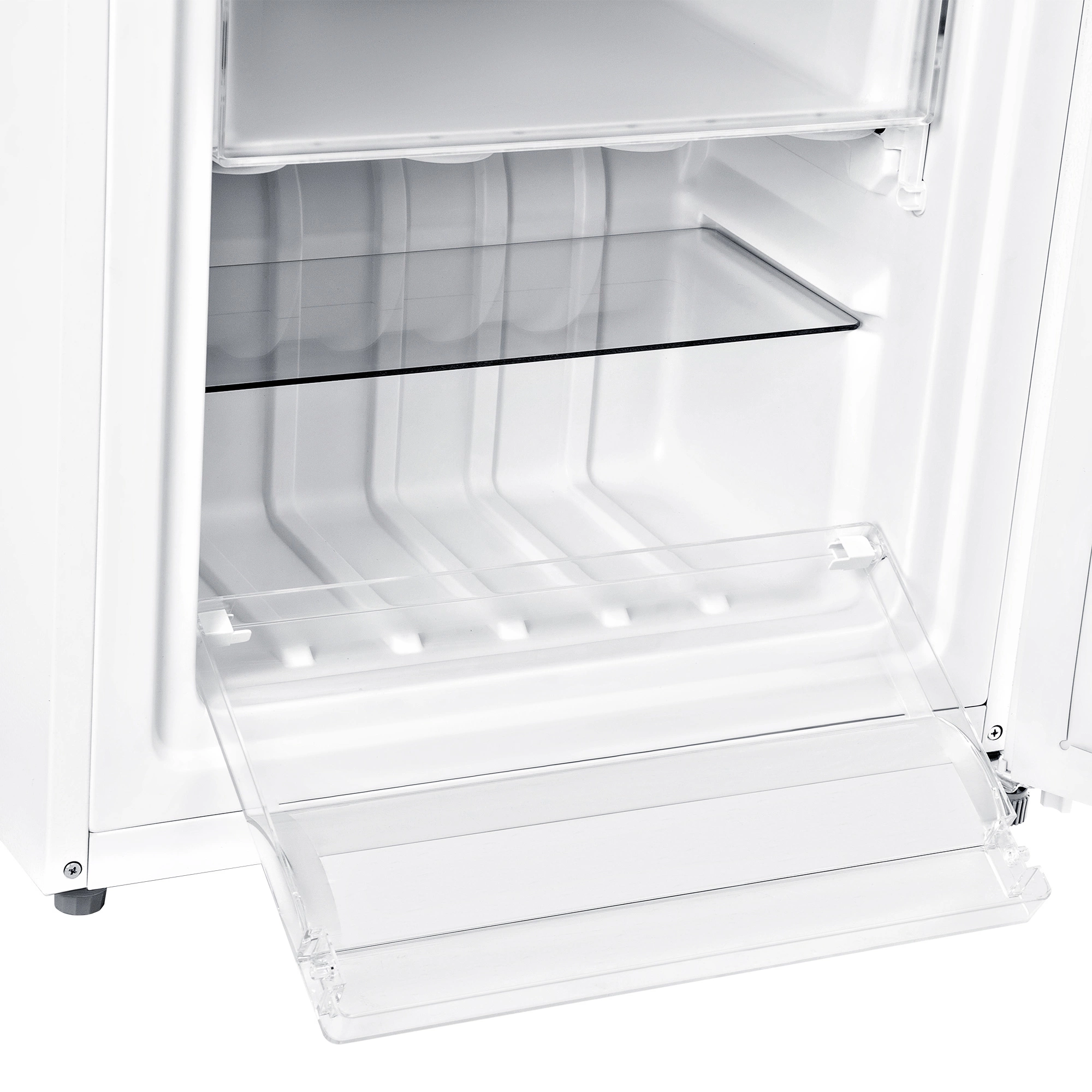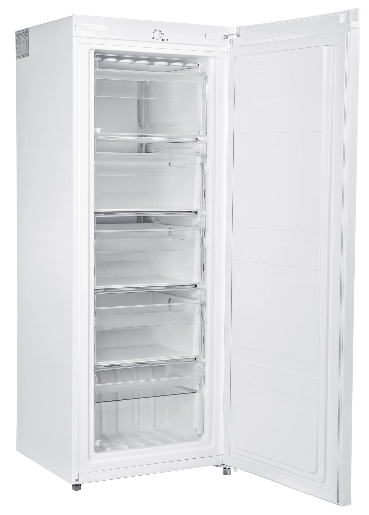 Единственный отсек прибора имеет вертикальную дверь, он разделён с помощью трёх ящиков и двух полок. Такая организация внутренней части данной модели помогает эргономично рассортировать продукты и обеспечить к каждому из них быстрый доступ. Полезный объём морозилки – 157 л, при этом она может охлаждать до выставленной температуры 10 кг/сут. Степень заморозки регулируется с помощью единственного поворотного переключателя, настроить этот параметр можно с высокой точностью, чтобы подобрать для пищи оптимальный режим хранения.