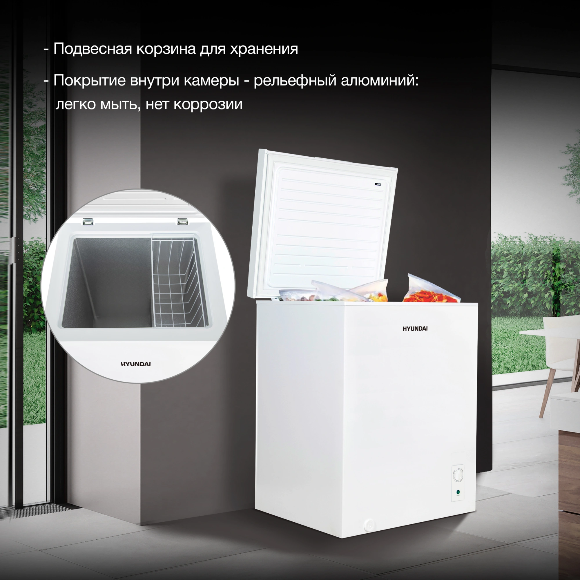 Белоснежный морозильный ларь Hyundai CH1505 с полезным объёмом 142 литра оснащен механическим управлением, удовлетворяет требованиям класса энергопотребления A. Общий объем составляет 156 литров. Размораживание выполняется вручную по мере возникновения такой необходимости. В данной модели предусмотрен режим ускоренной заморозки. После аварийного обесточивания продукты сохраняются в надлежащем виде в течение 30 часов. Охлаждение камеры производится с помощью единственного компрессора и хладагента. Уровень шума не доставляет дискомфортных ощущений пользователю. Дверца, представляющая собой крышку морозильника, открывается вверх.