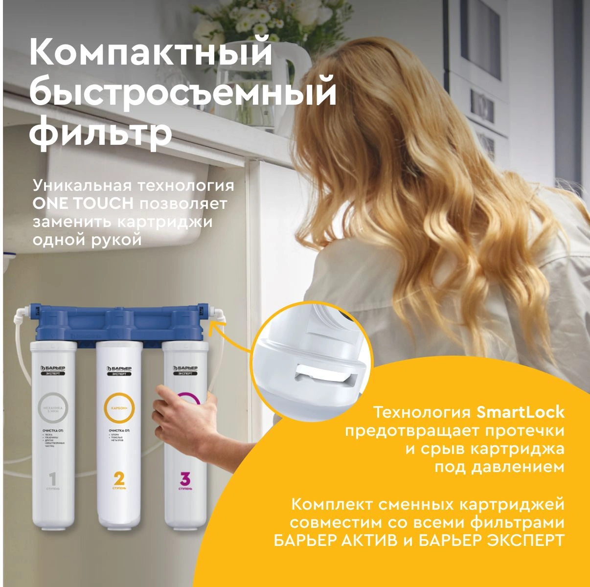 Изменённая версия нашей популярной модели Барьер EXPERT, обеспечивает комплексную очистку от продуктов хлорирования и всех основных содержащихся в ней вредных примесей. Картриджи всё так же можно менять одной рукой, теперь положение фильтрующих элементов статично.