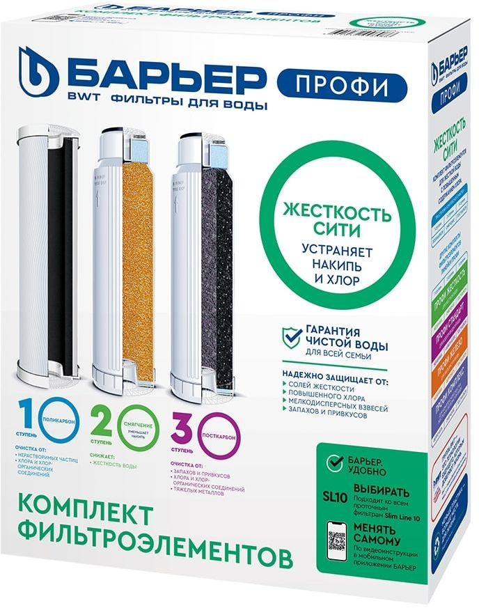 Набор из трех картриджей для фильтров Профи Жесткость Сити для жёсткой и сильно хлорированной воды с увеличенным ресурсом по удалению хлора. Позволяет забыть о накипи. Обеспечивает более глубокую очистку от хлора и побочных продуктов хлорирования за счёт нового картриджа Поликарбон.