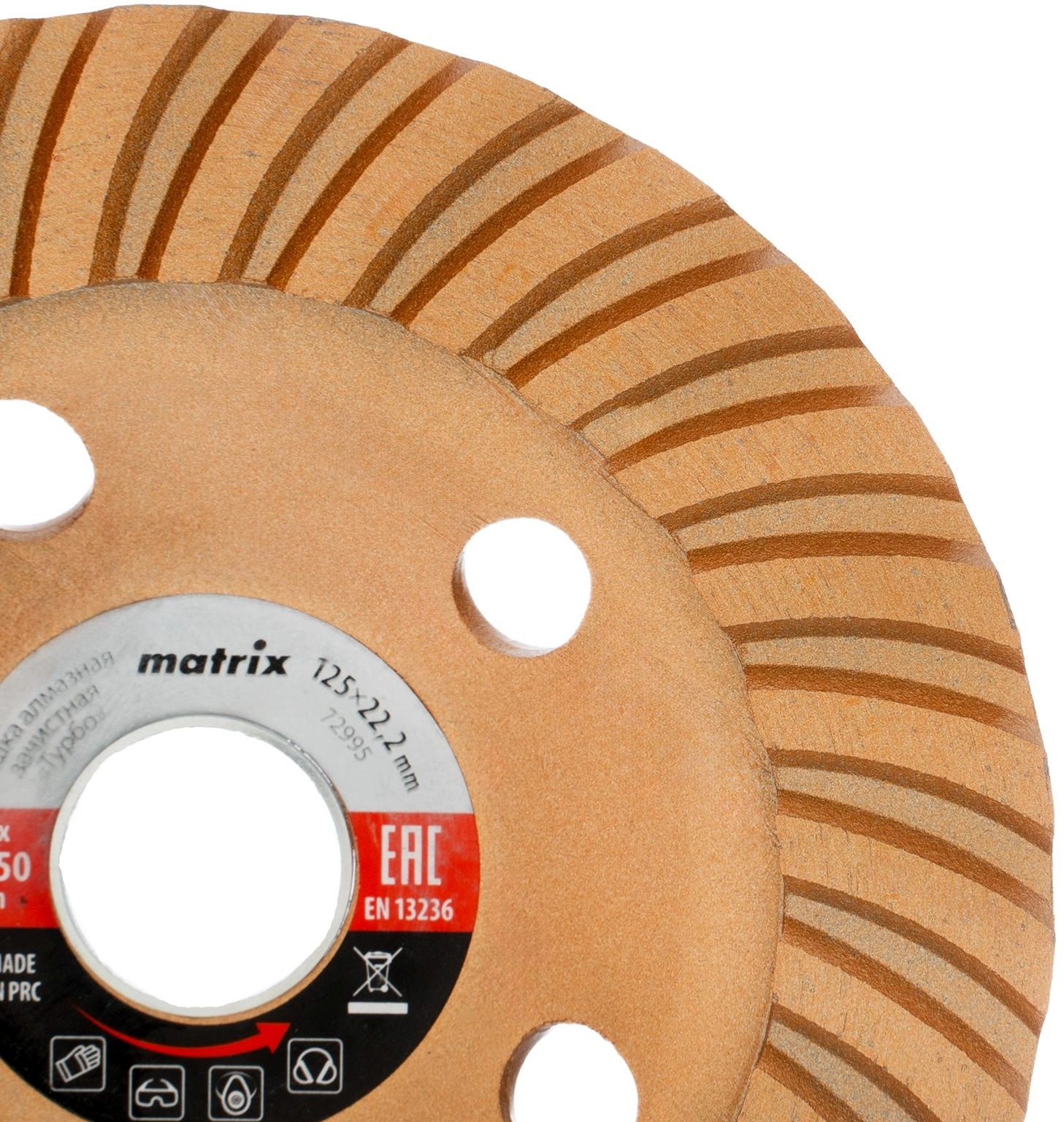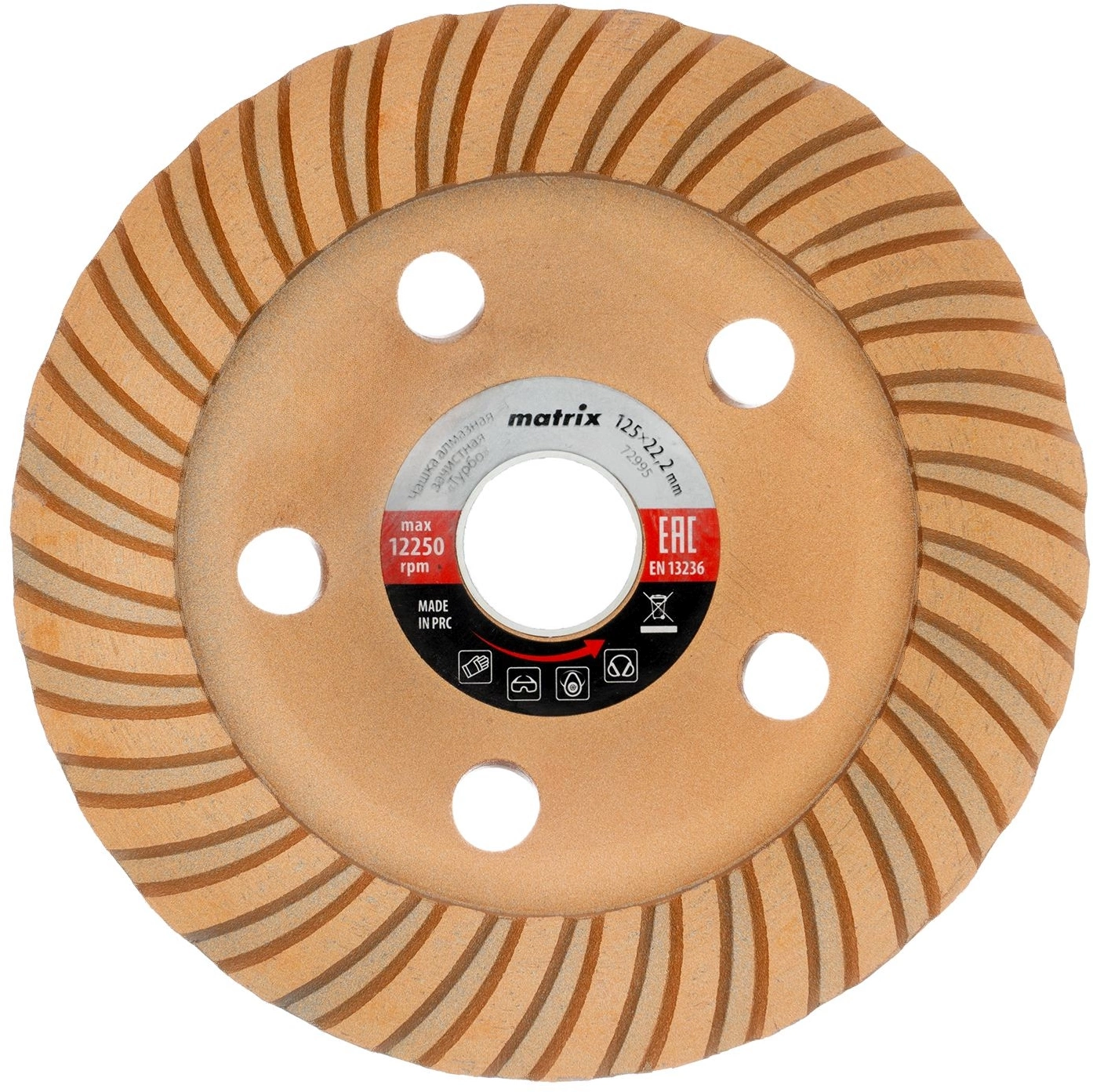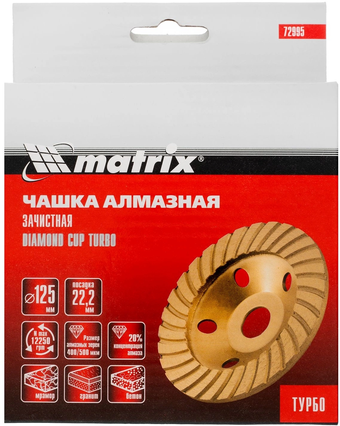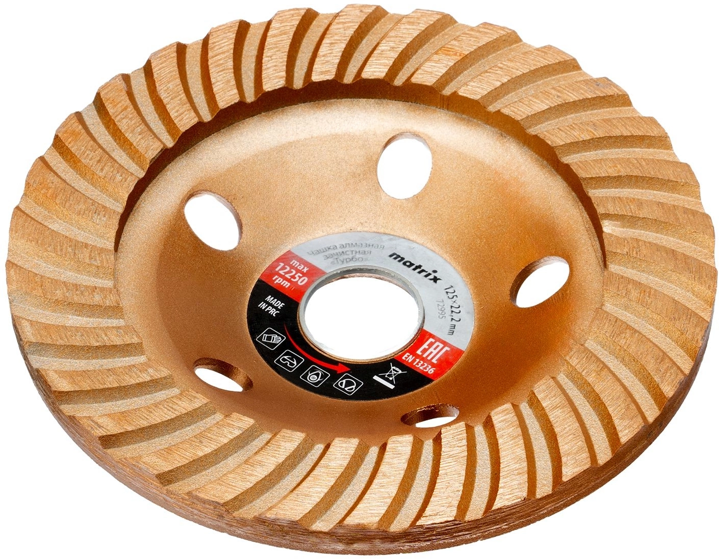 Чашка алмазная "Turbo" ТМ Matrix предназначена для шлифования бетона, гранита, мрамора, кирпича, камня. Данный тип чашки рекомендуется для чистовой обработки, когда необходимо получить гладкую и ровную поверхность. Допускается применять для снятие фаски на мраморной и гранитной плите.