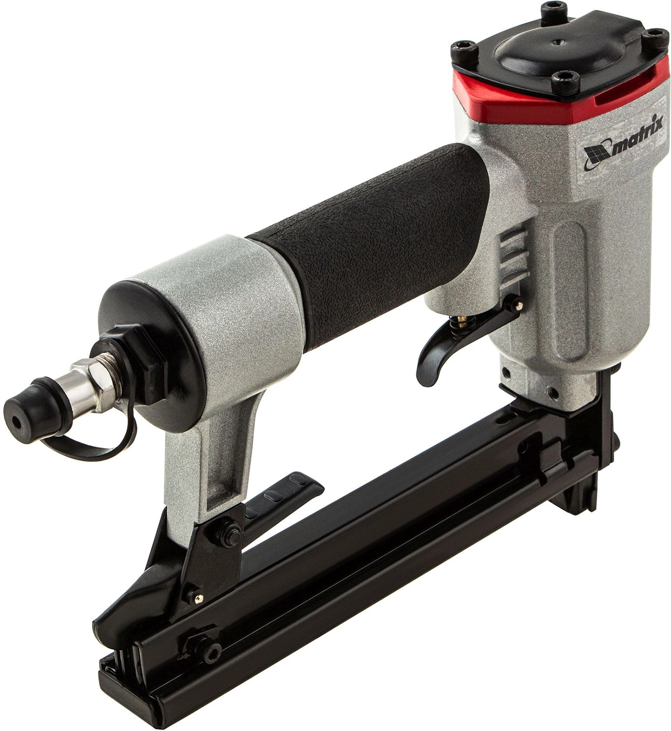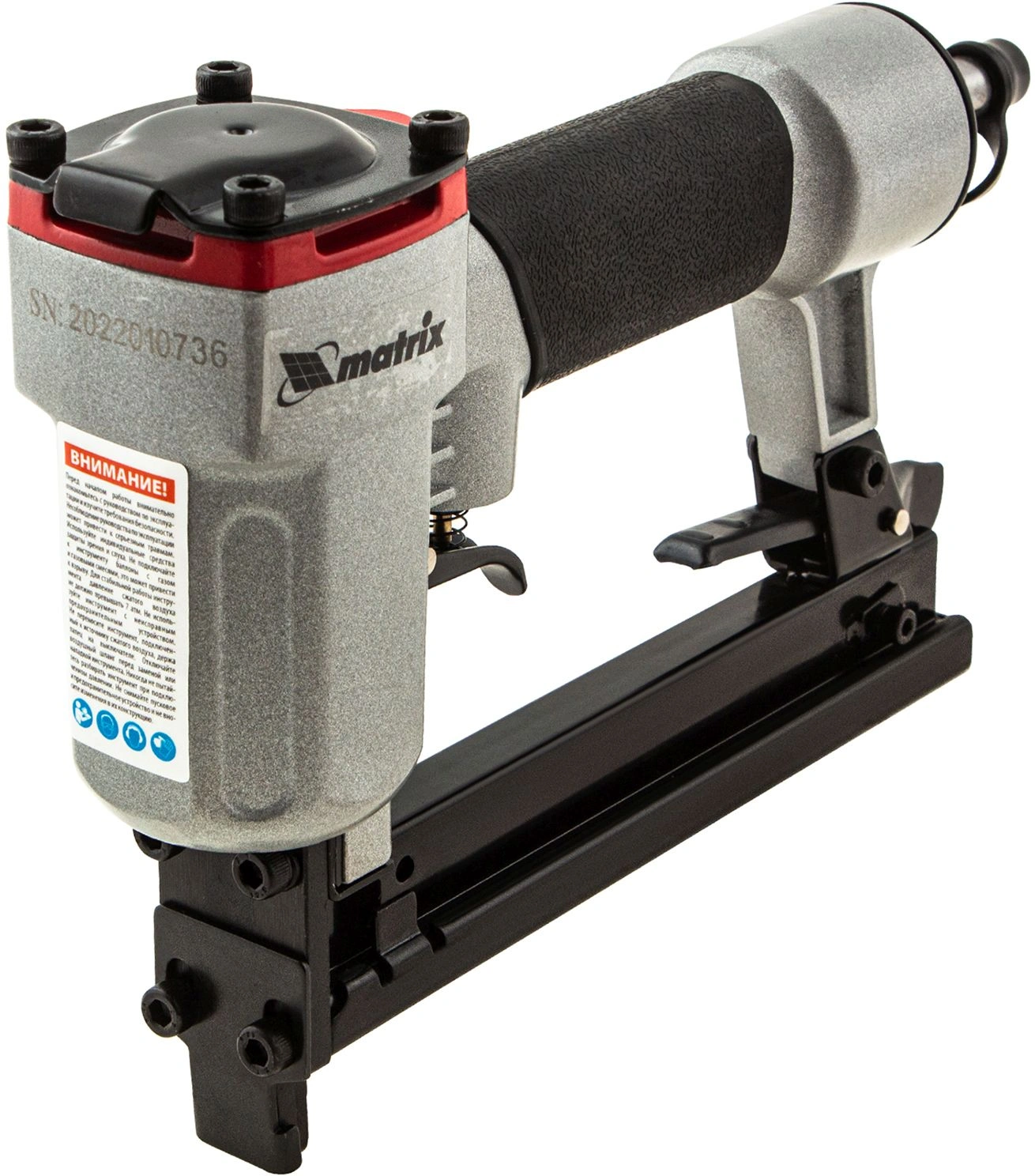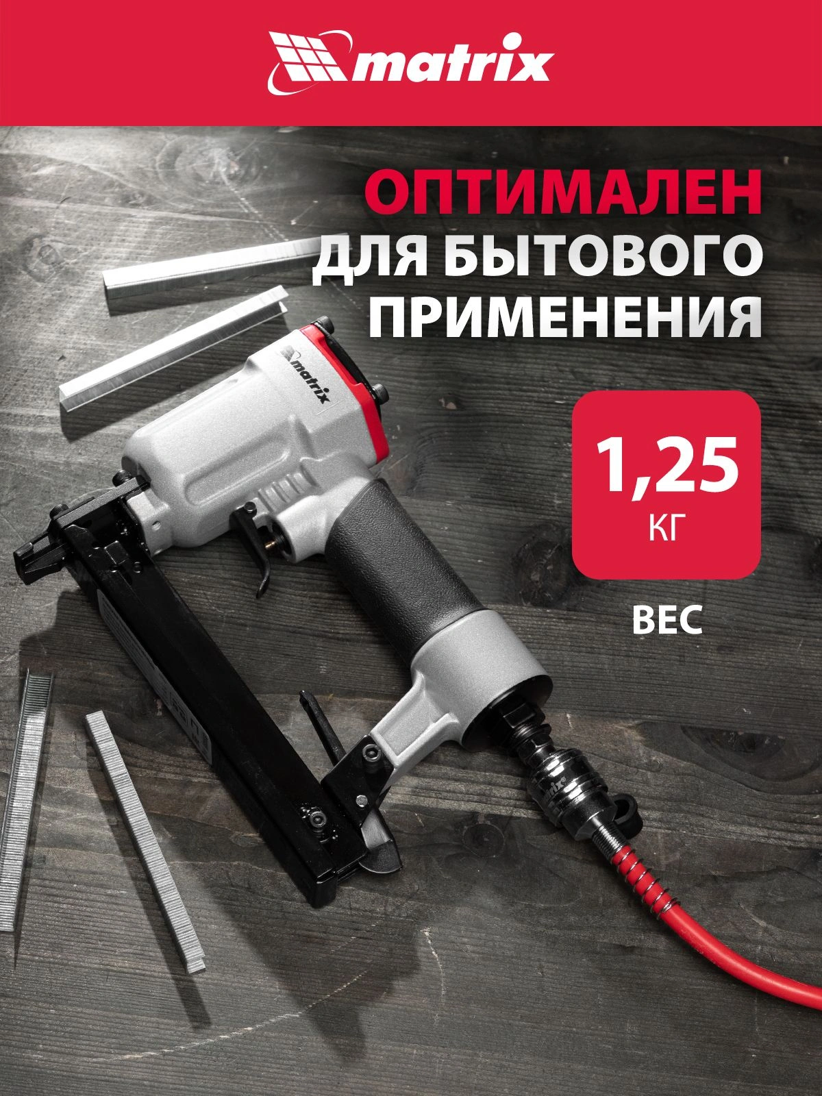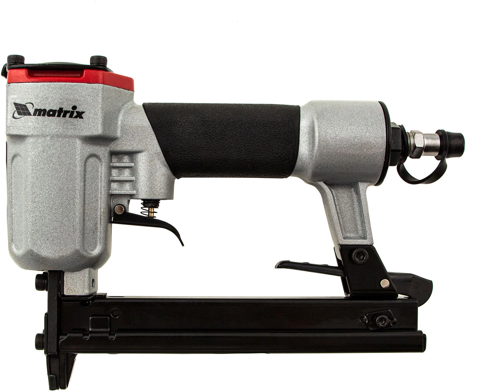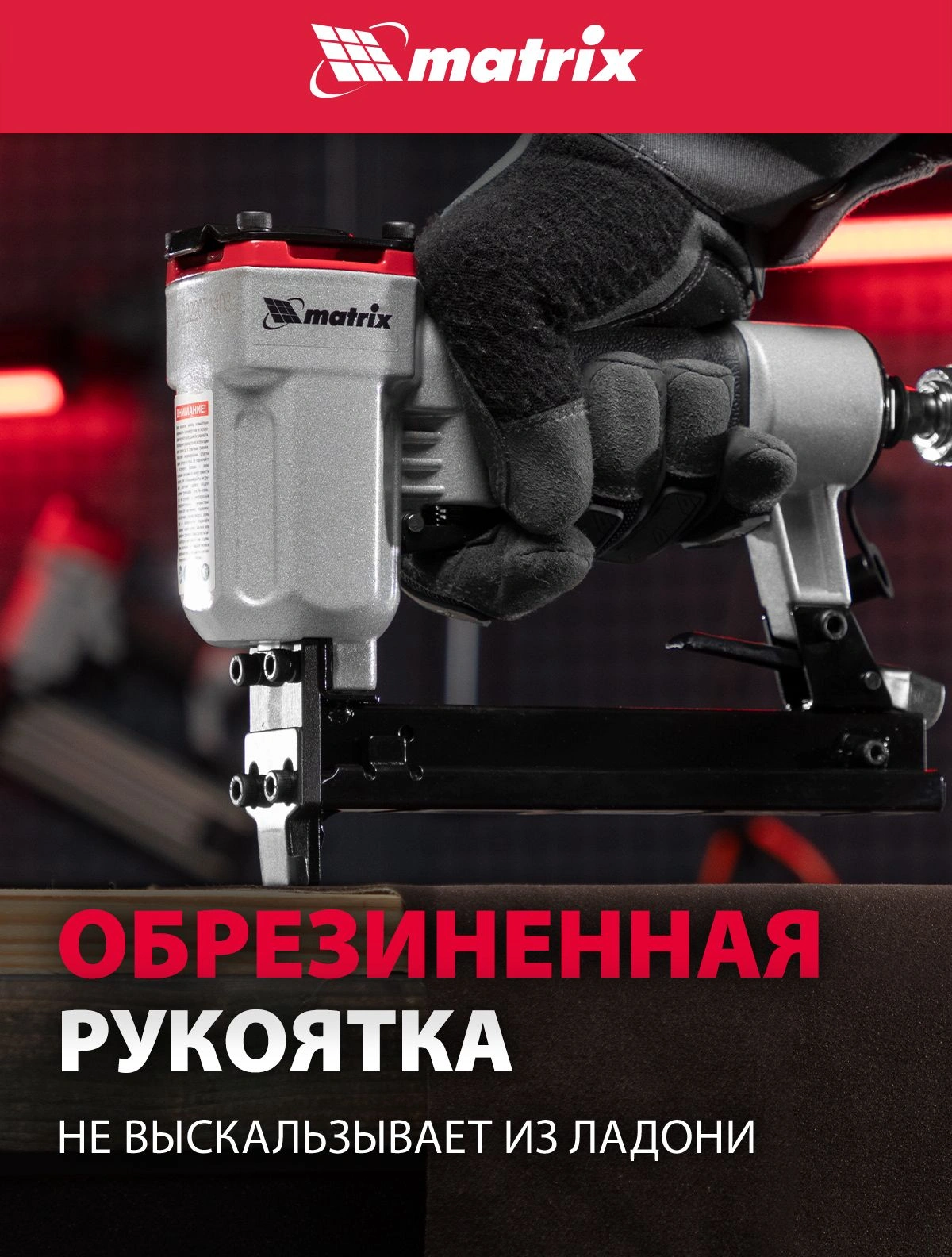 Инструмент обладает высокой прочностью, так как он полностью выполнен из качественных и износостойких материалов. На корпусе пневматического степлера MATRIX 57420 есть специальное покрытие для удобного обхвата и удержания инструмента.