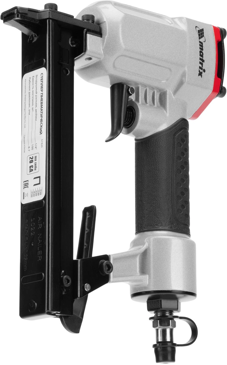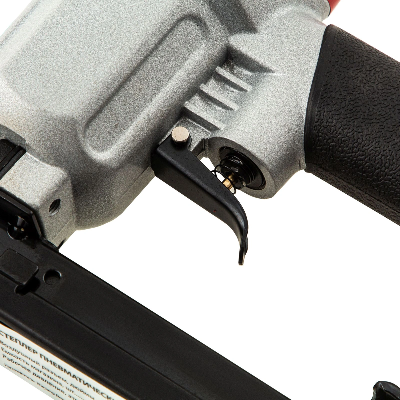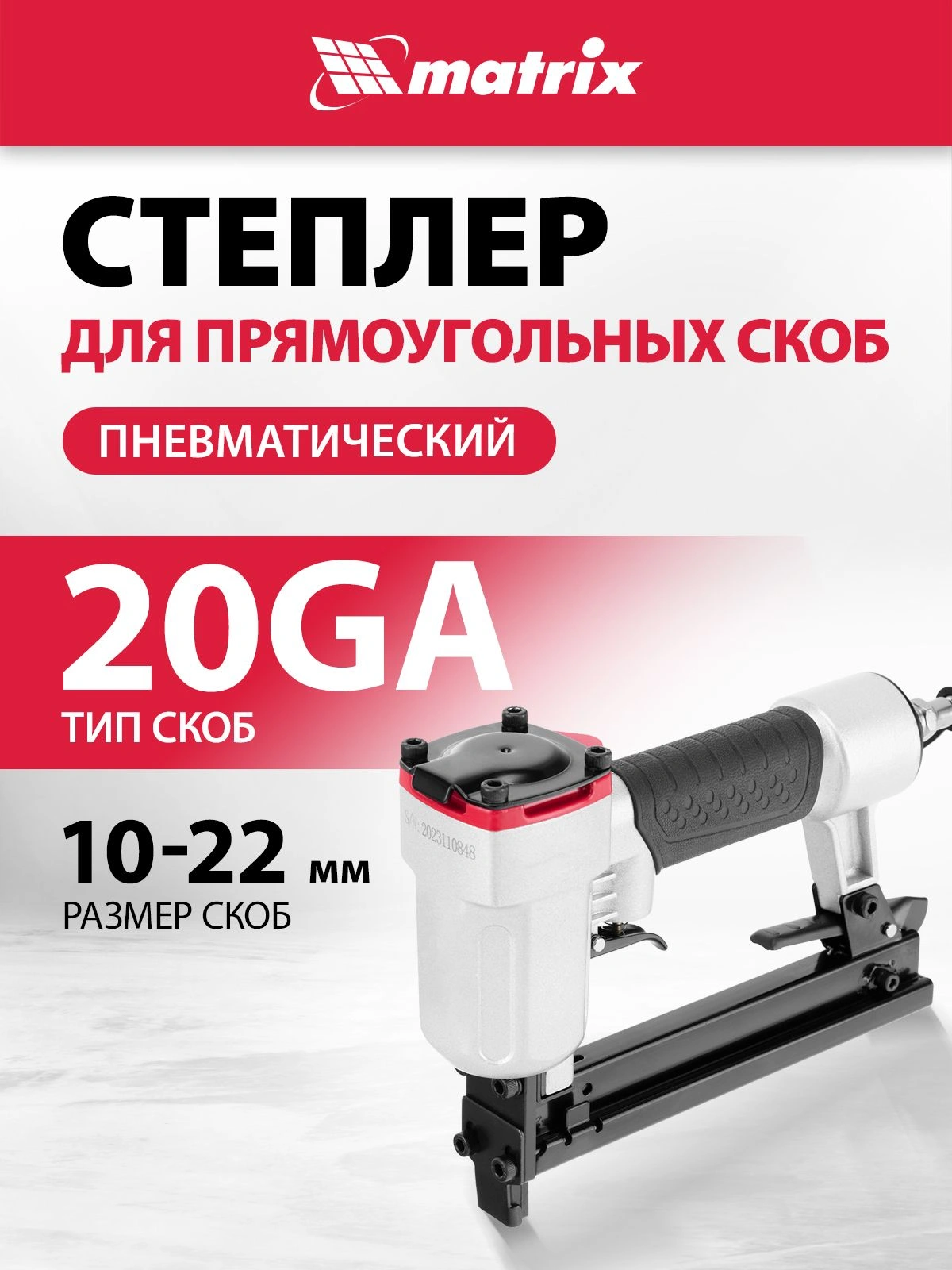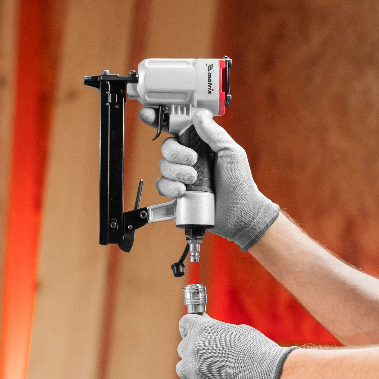 Инструмент обладает высокой прочностью, так как он полностью выполнен из качественных и износостойких материалов. На корпусе пневматического степлера MATRIX 57420 есть специальное покрытие для удобного обхвата и удержания инструмента.