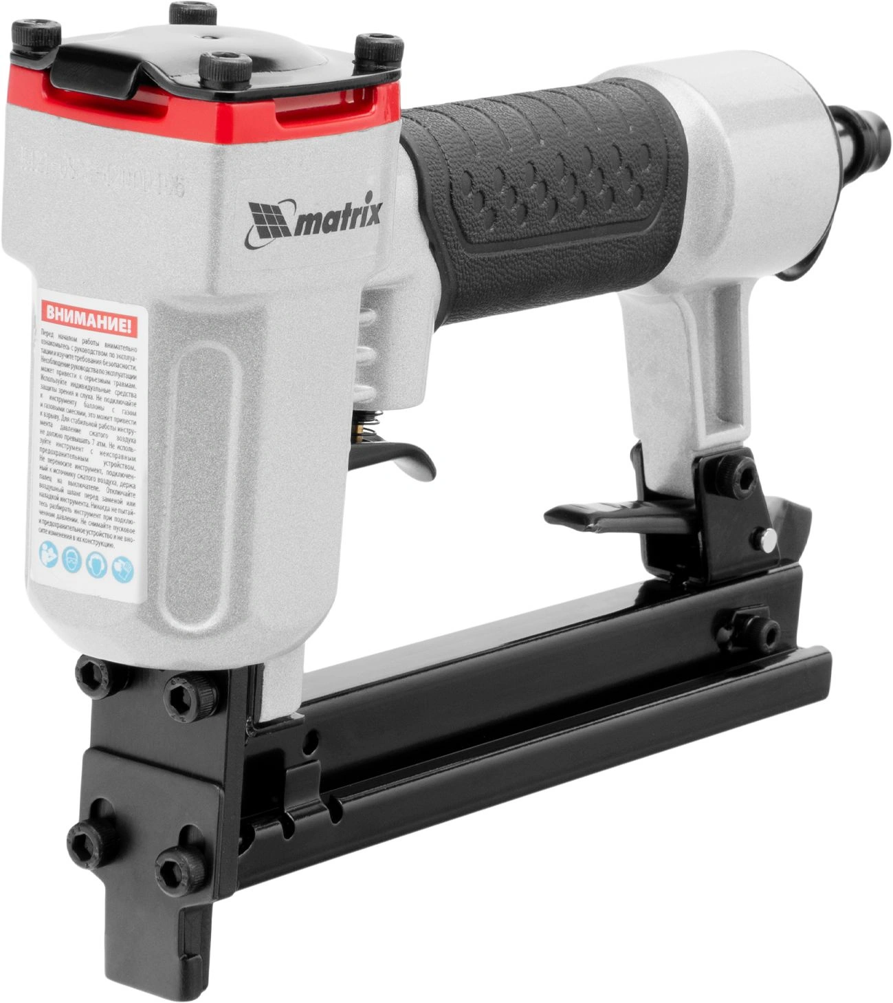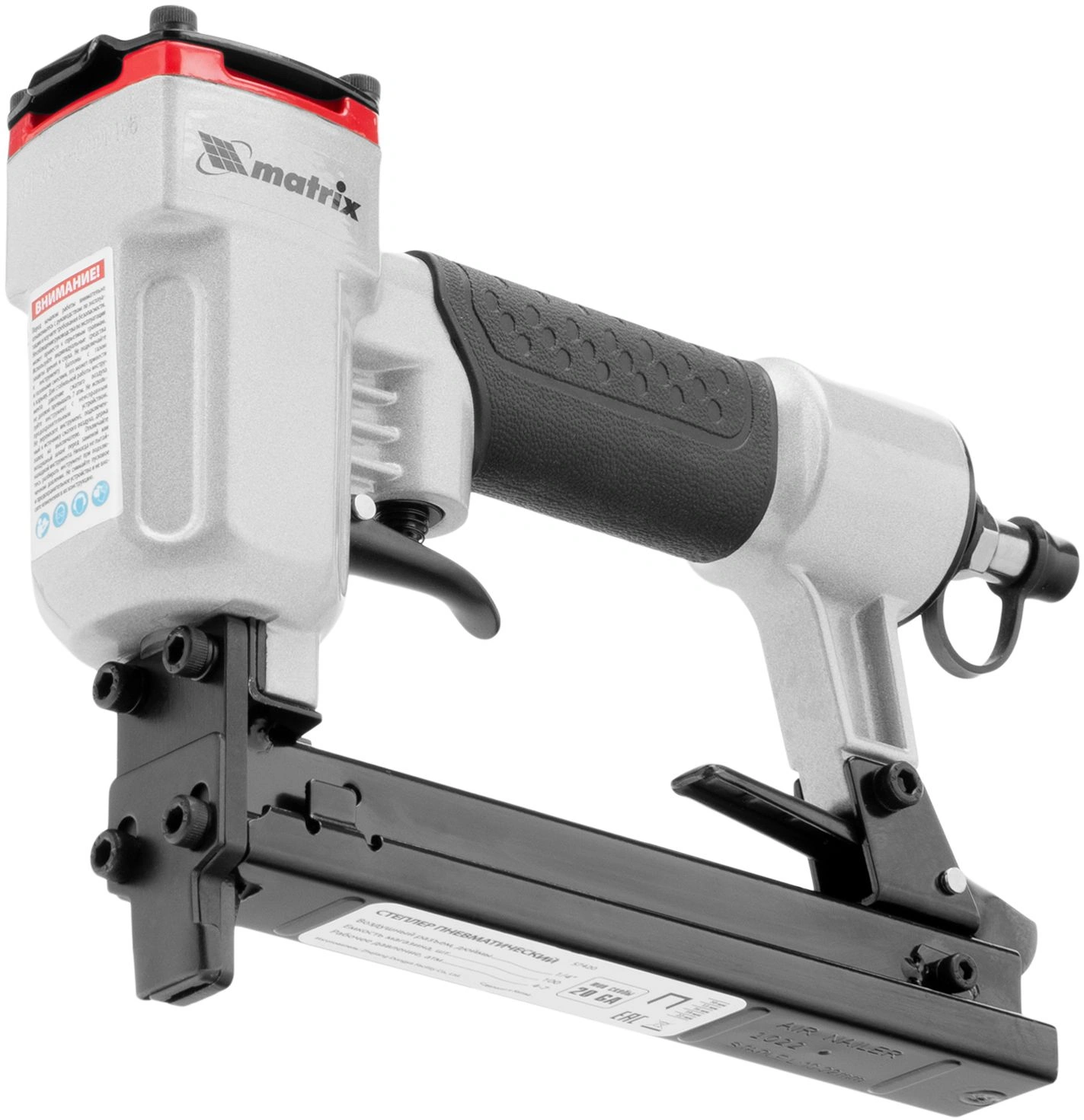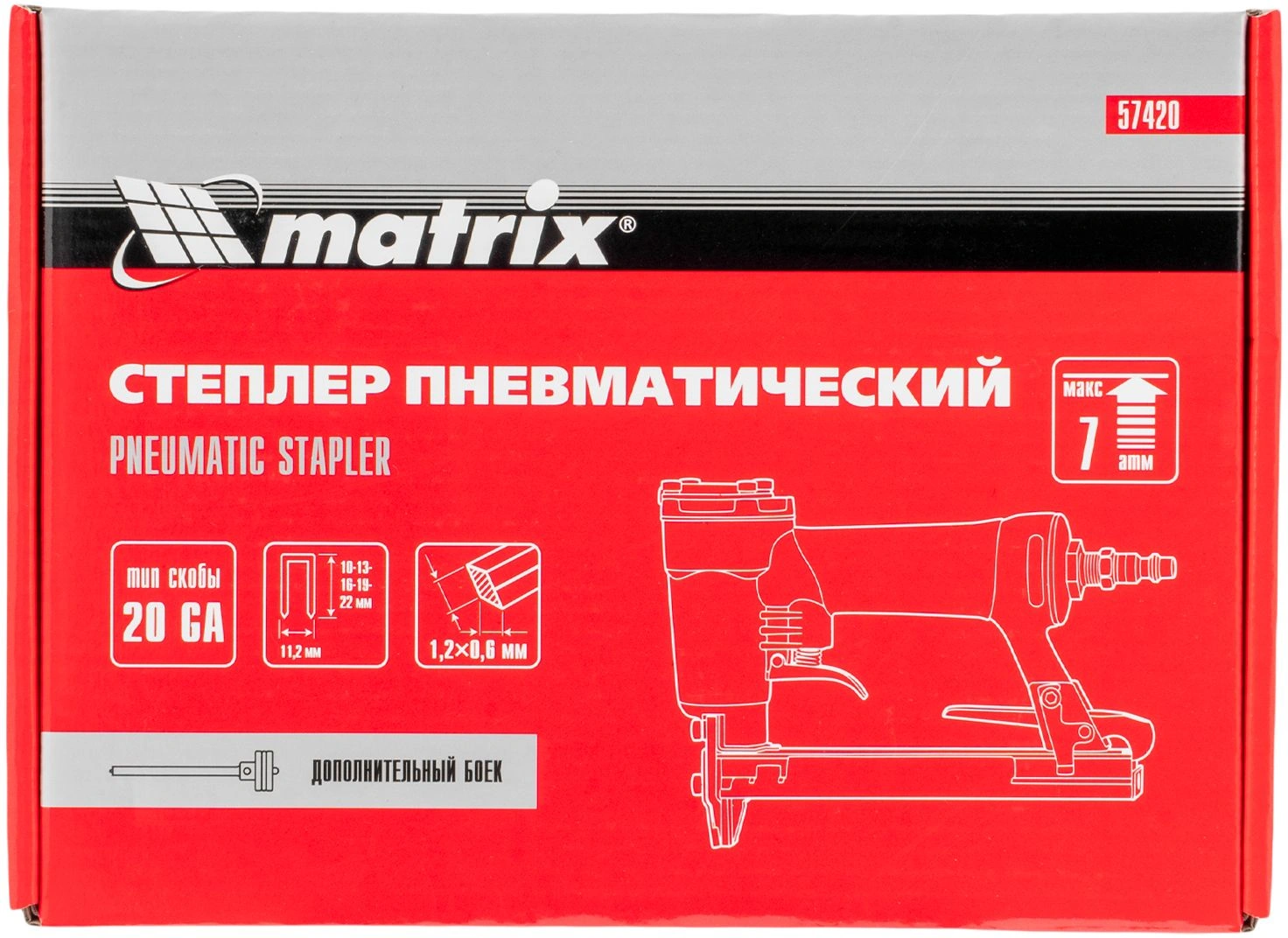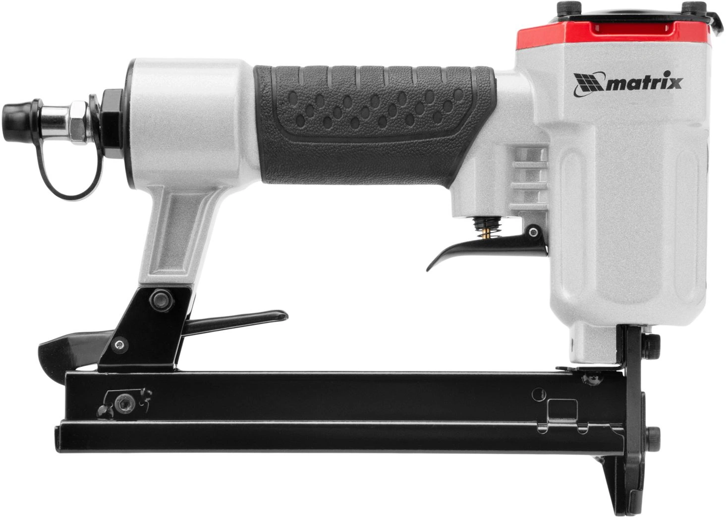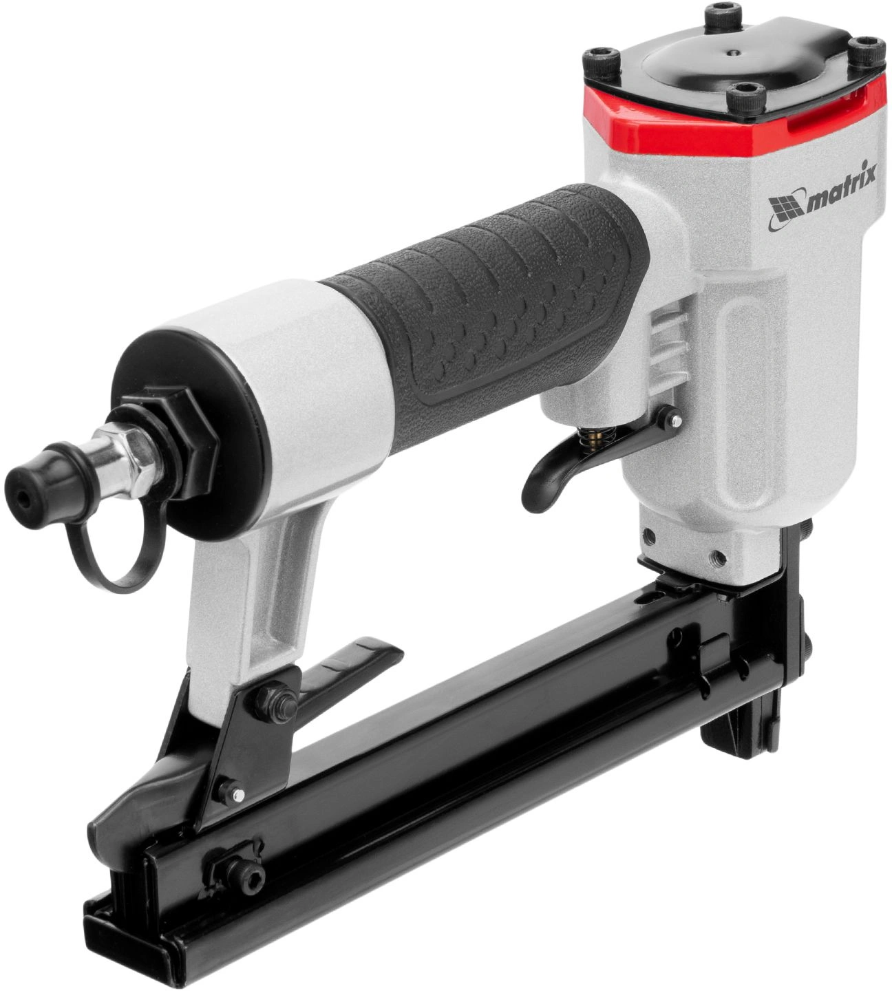 Инструмент обладает высокой прочностью, так как он полностью выполнен из качественных и износостойких материалов. На корпусе пневматического степлера MATRIX 57420 есть специальное покрытие для удобного обхвата и удержания инструмента.