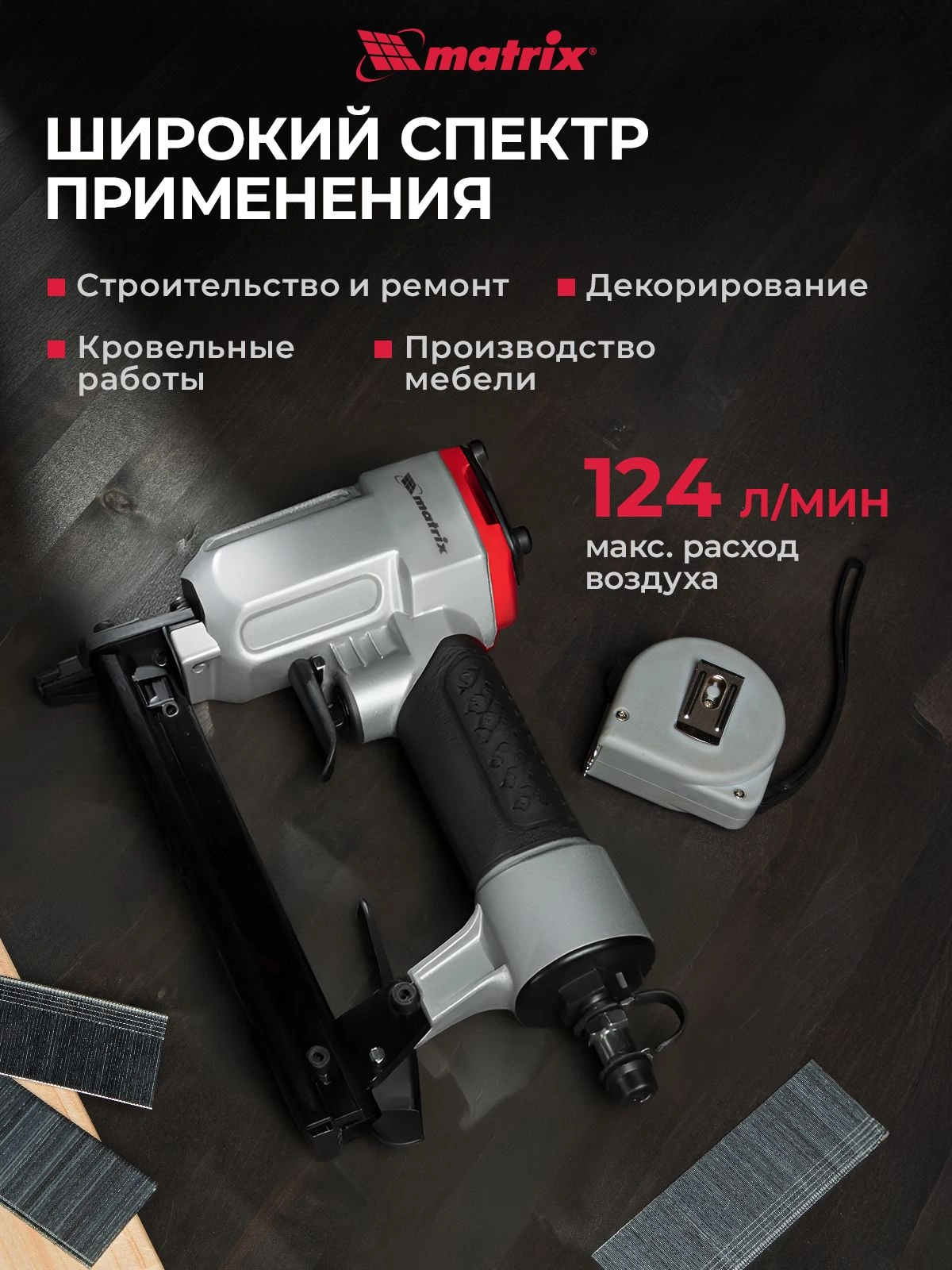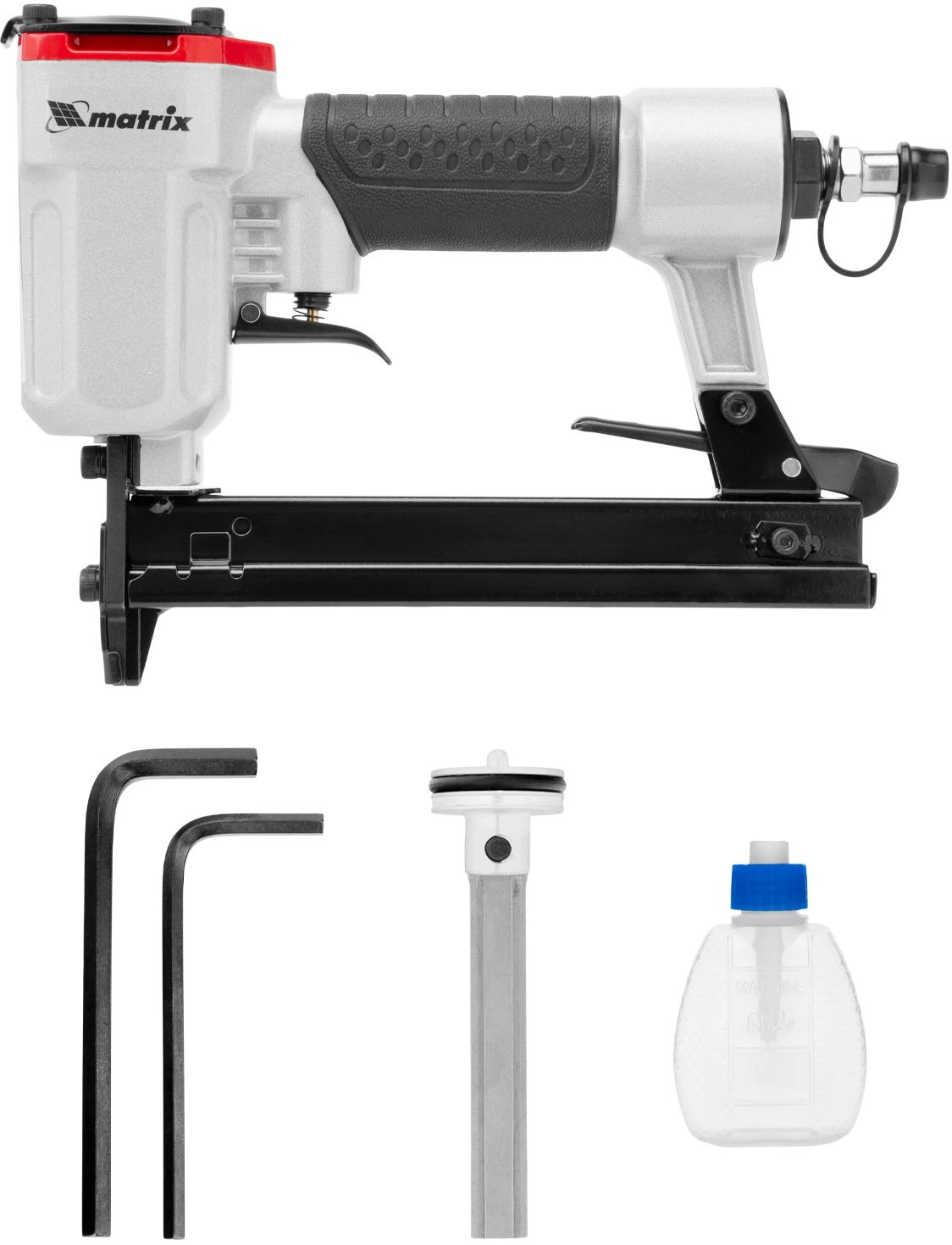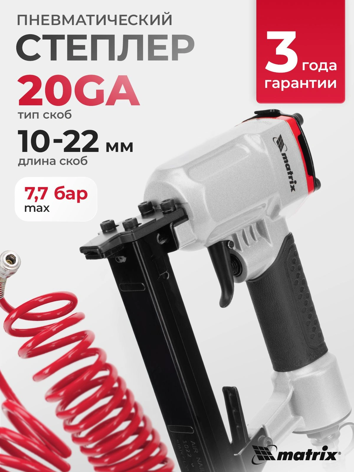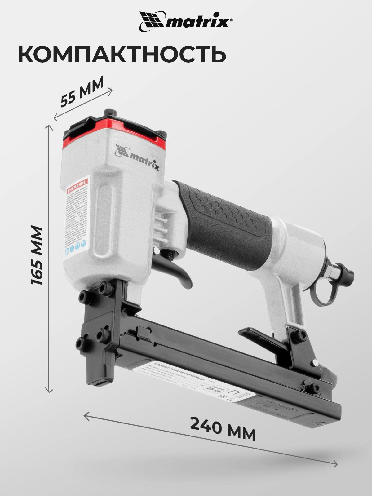 Инструмент обладает высокой прочностью, так как он полностью выполнен из качественных и износостойких материалов. На корпусе пневматического степлера MATRIX 57420 есть специальное покрытие для удобного обхвата и удержания инструмента.