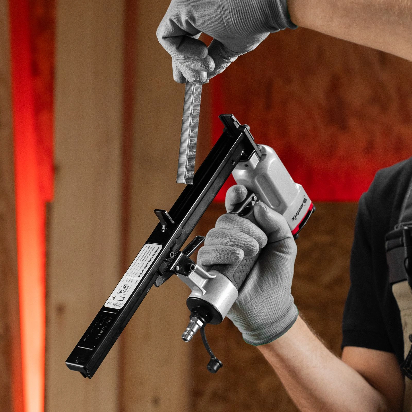 Степлер пневматический широкополосный с емкостью магазина на 160 скоб размера 20GA предназначен для быстрого и надежного крепления фанеры, ДВП, гипсокартона, кожи, ткани и бумаги к деревянным поверхностям. Диапазон рабочего давления – 60–100 фунтов на кв. дюйм (0,4–0,7 МПа). Размер скоб: 10-22 мм.