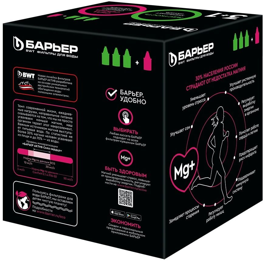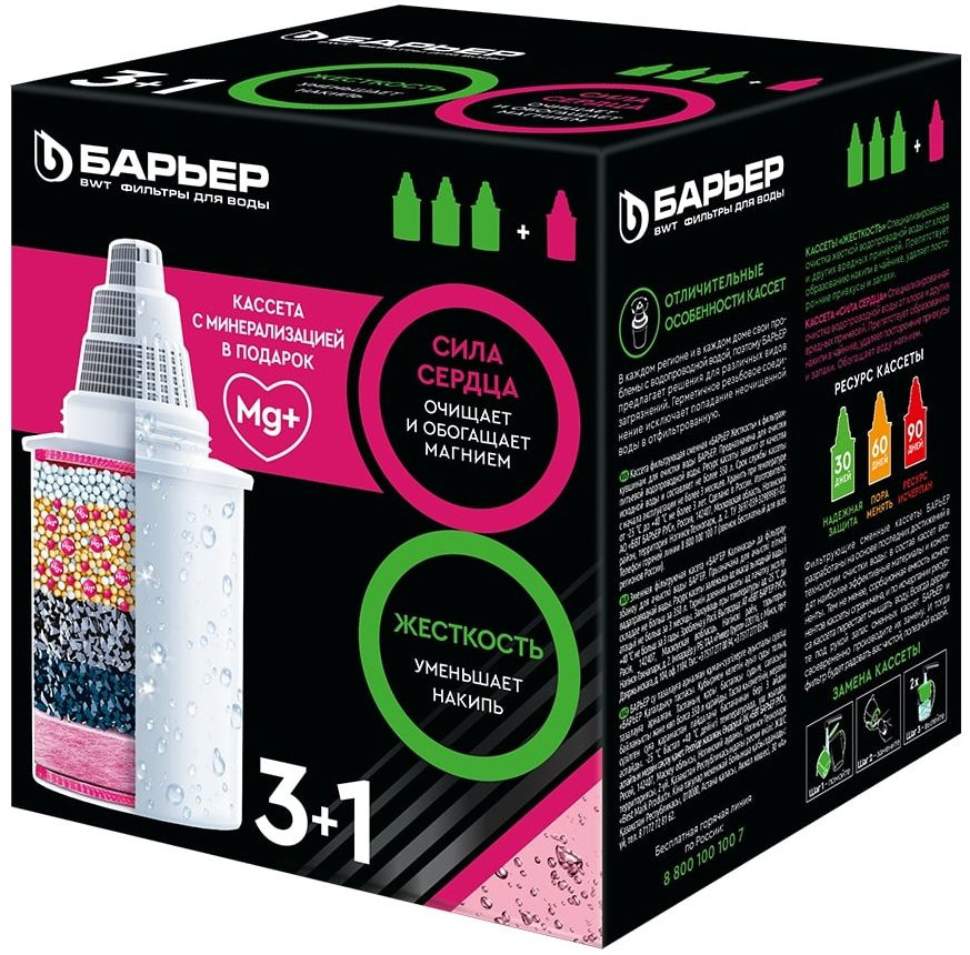 Убирает излишнюю жесткость воды, препятствуя образованию накипи. Удаляют хлор и ионы тяжелых металлов. Герметичное резьбовое крепление кассеты к воронке кувшина исключает попадание неочищенной воды из воронки в отфильтрованную воду.