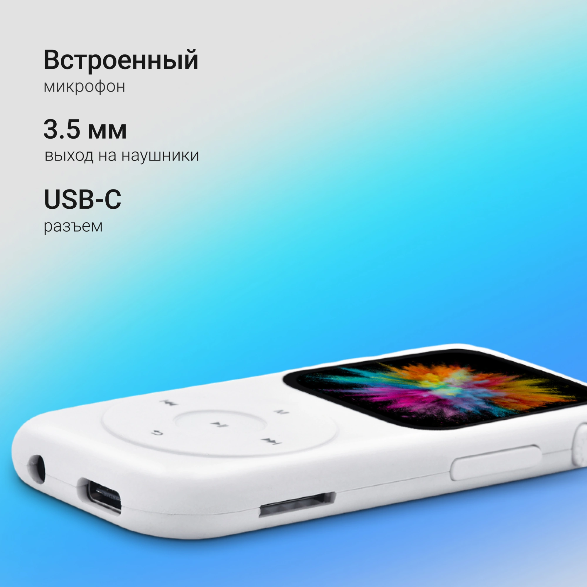 Благодаря минималистичному дизайну и классическому белому цвету медиаплеер выглядит как музыкальный аксессуар. Устройство поддерживает популярные форматы видео (AMV, AVI), аудио (OGG, AAC, APE, MP3, WAV, FLAC, M4A), изображений (GIF, JPG, BMP).