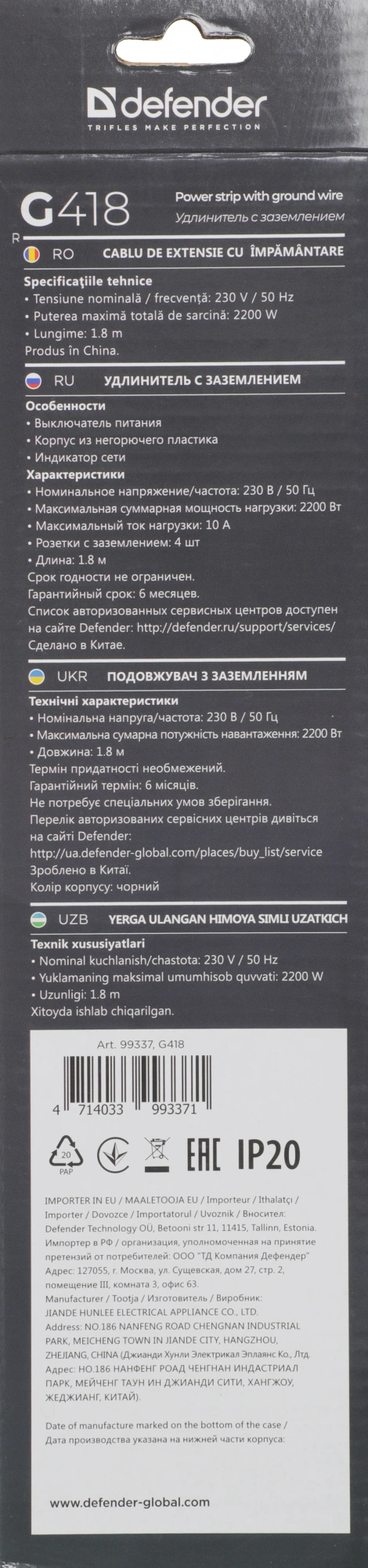 1.8м (4 розетки) черный (коробка)