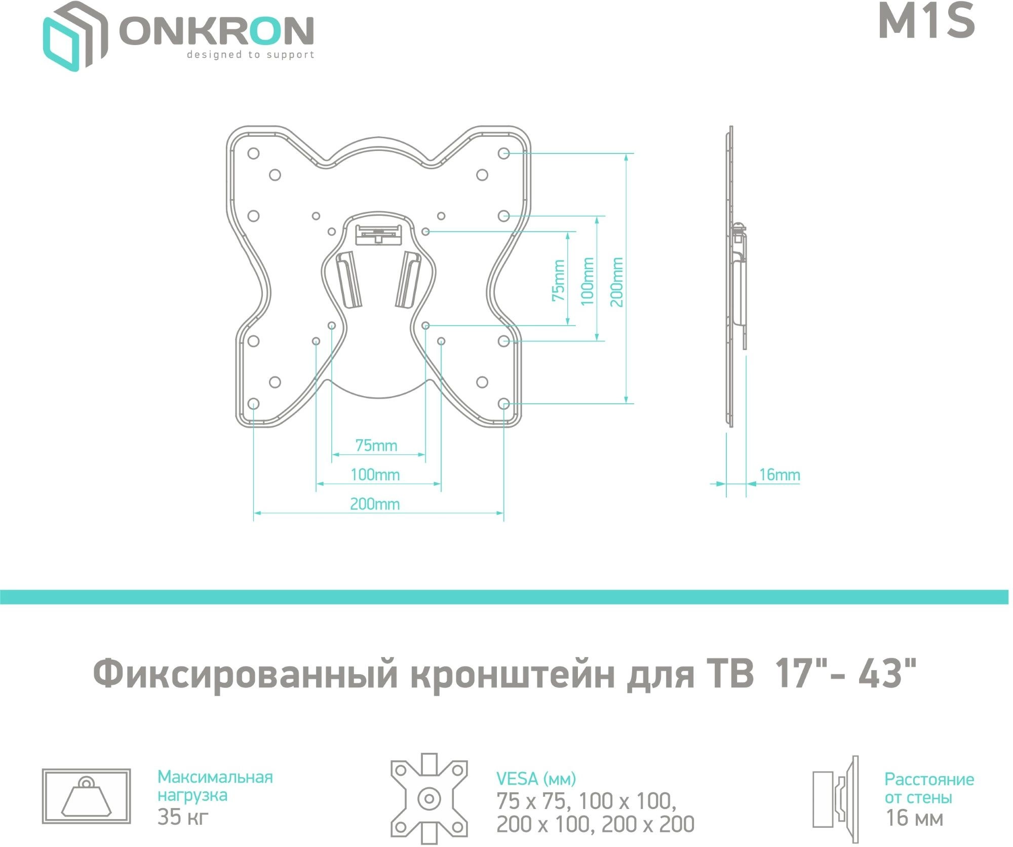 Настенный наклонно-поворотный кронштейн ONKRON M1S предназначен для ТВ с диагональю от 17 до 43 дюймов . Он подходит для небольших телевизоров и мониторов весом до 35 кг.